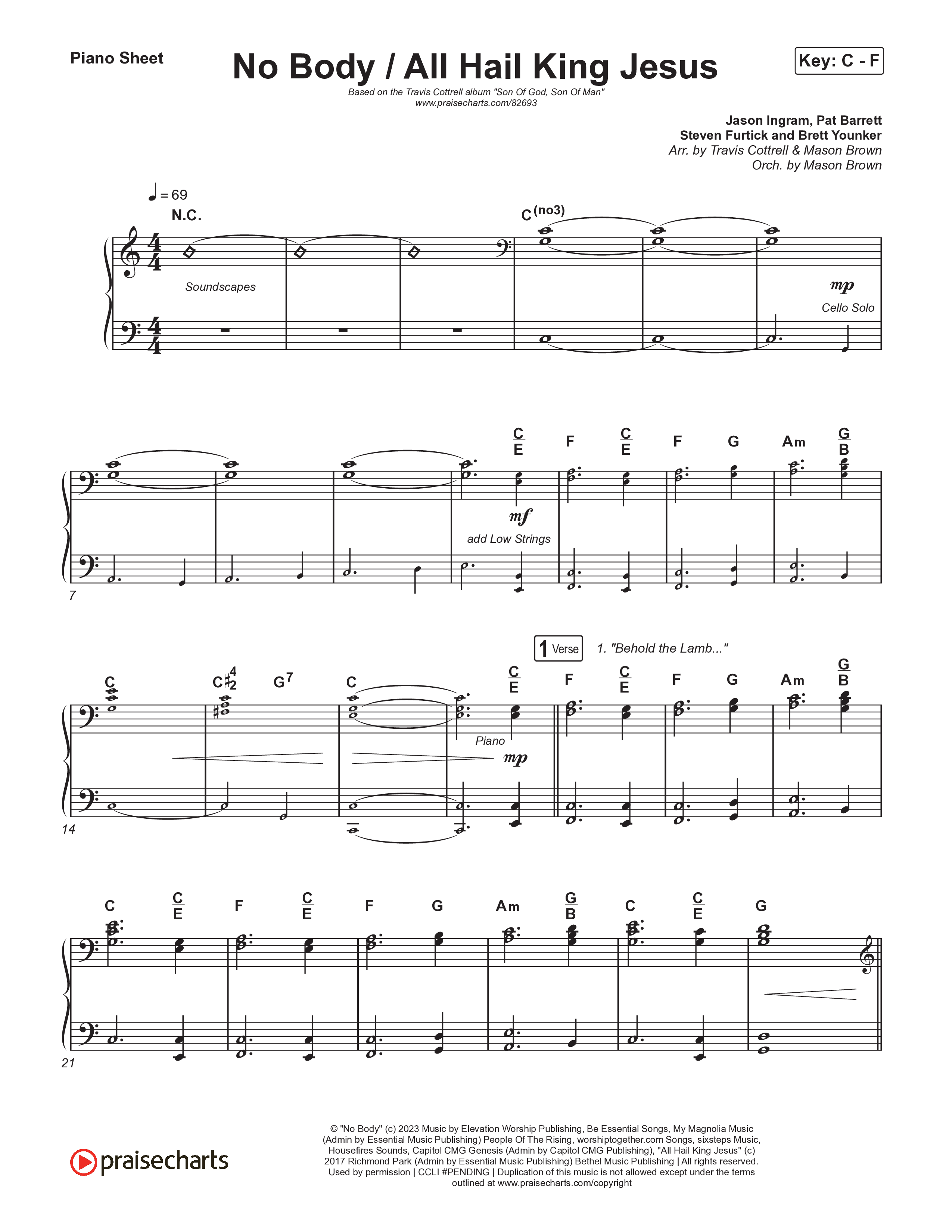Download the piano sheet for No Body / All Hail King Jesus (Choral/SATB) by Travis Cottrell / Skye Reedy / Arr. Mason Brown, from the album Son Of God Son Of Man. This song was arranged by Travis Cottrell / Mason Brown in the key of Bb, C.