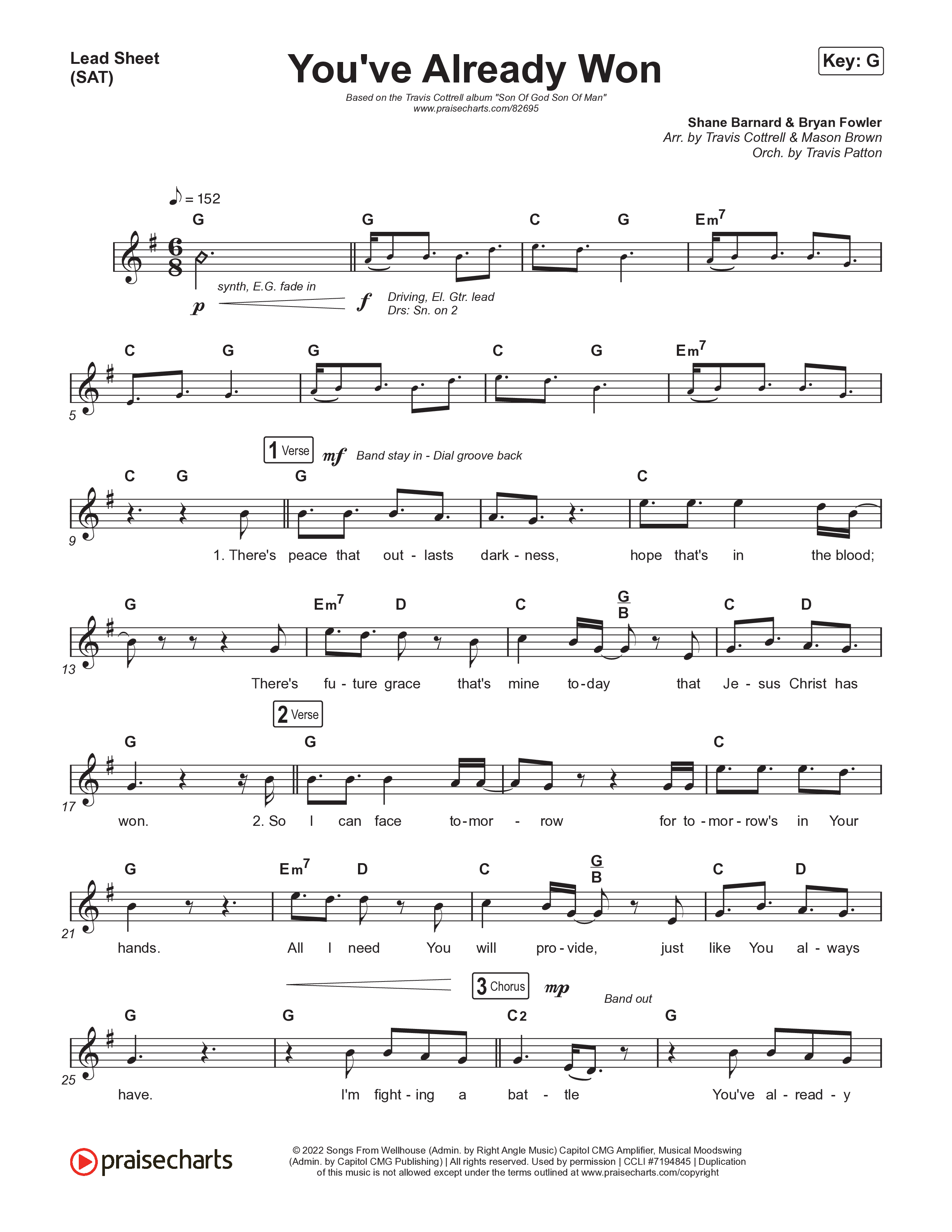 Download the sheet music for You've Already Won (Choral/SATB) by Travis Cottrell / Meredith Andrews / Arr. Mason Brown / Orch. Travis Patton, from the album Son Of God Son Of Man. This song was arranged by Travis Cottrell / Mason Brown / Travis Patton in the key of G.