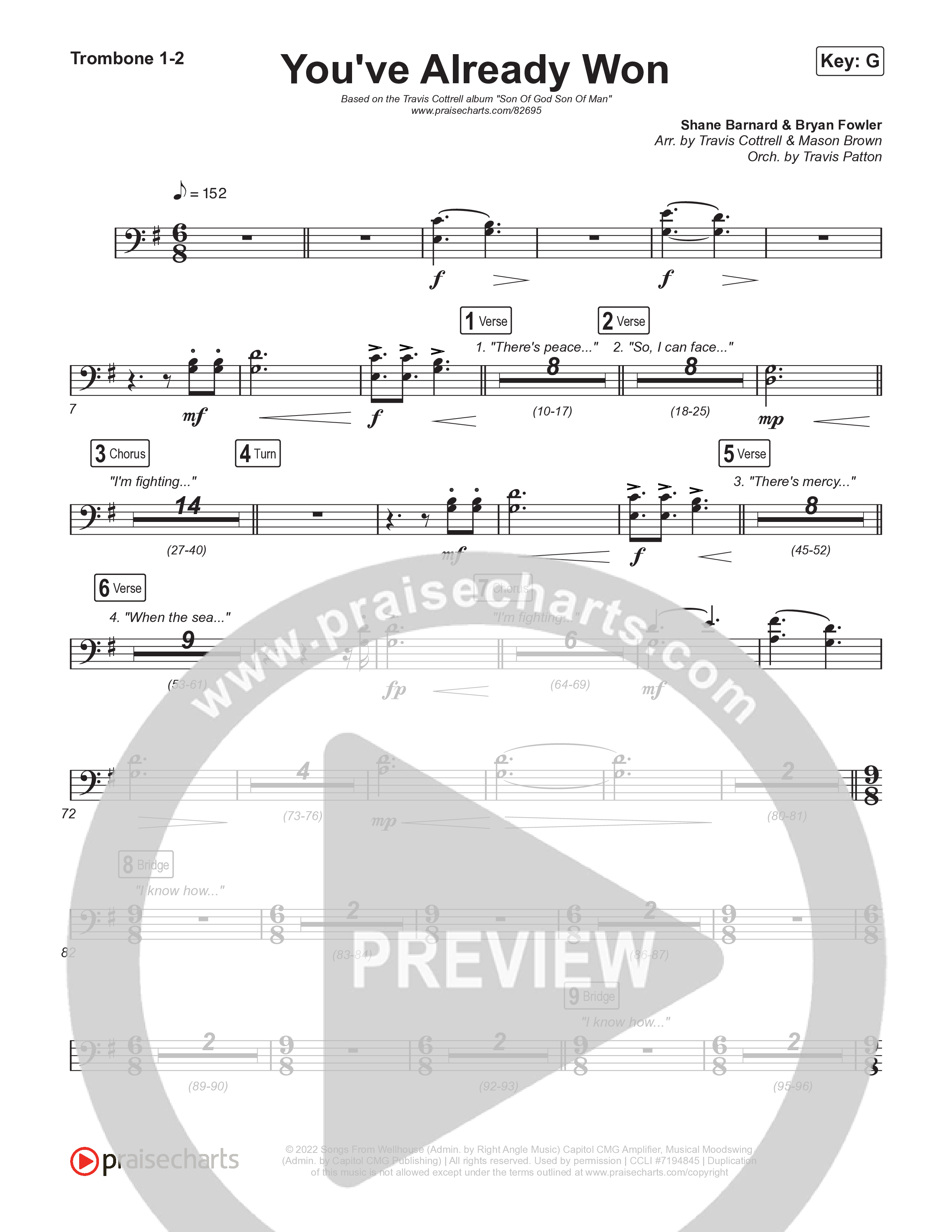 Download the Trombone 1,2 sheet music for You've Already Won (Choral/SATB) by Travis Cottrell / Meredith Andrews / Arr. Mason Brown / Orch. Travis Patton, from the album Son Of God Son Of Man. This song was arranged by Travis Cottrell / Mason Brown / Travis Patton in the key of F, G.