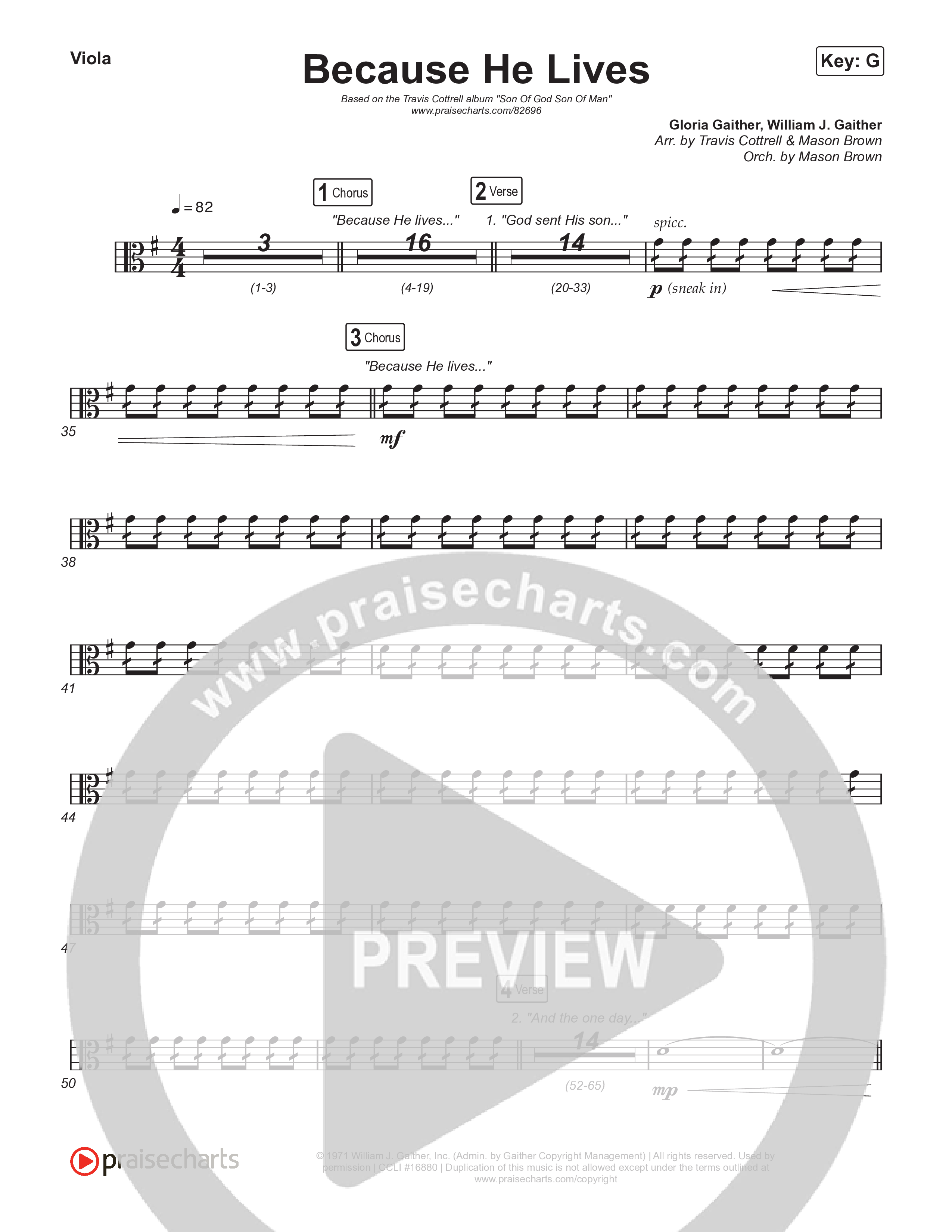 Download the Orchestration string parts for Because He Lives (Choral/SATB) by Travis Cottrell / Brooke Voland / Arr. Mason Brown, from the album Son Of God Son Of Man. This song was arranged by Travis Cottrell / Mason Brown in the key of F, G.