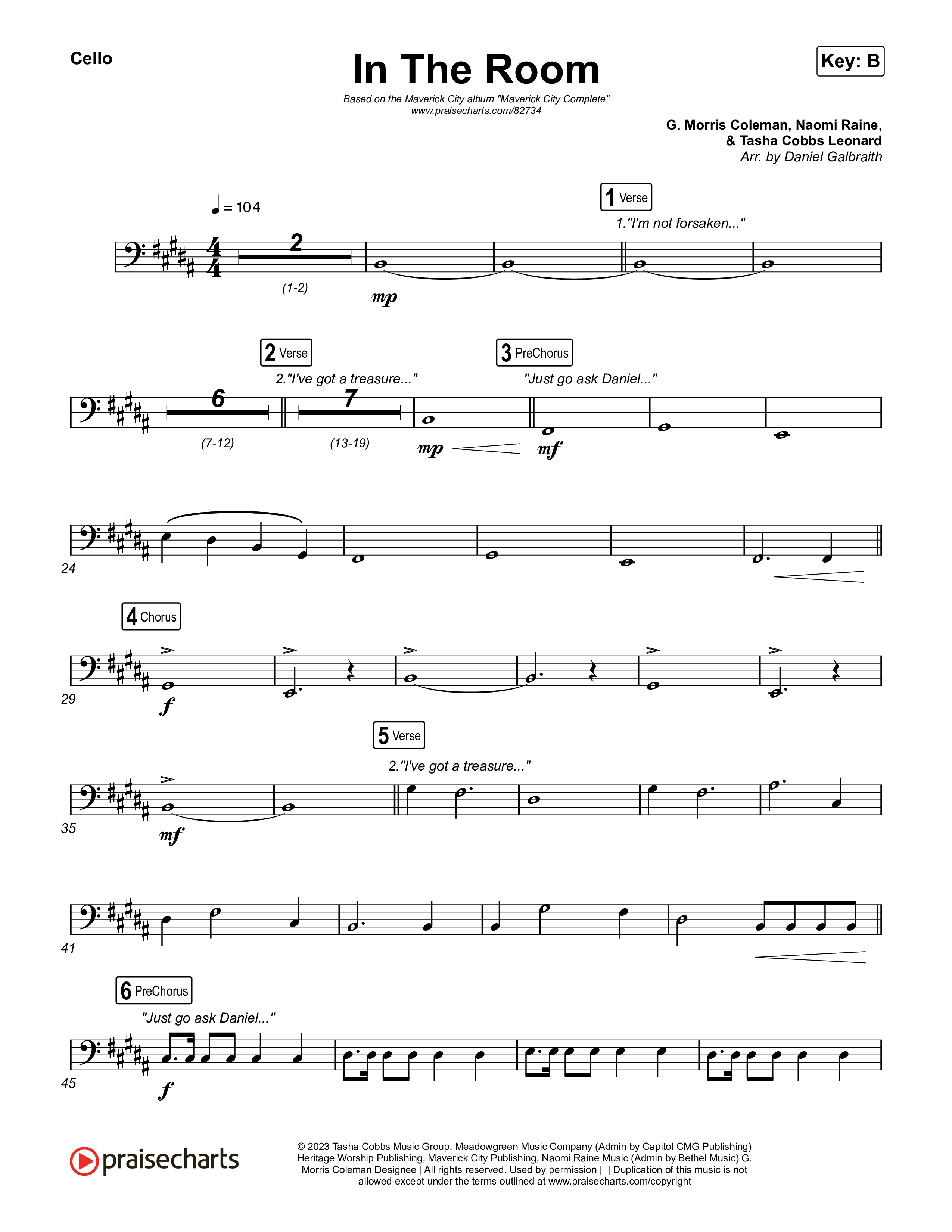 Download the Cello sheet music for In The Room by Maverick City Music / Tasha Cobbs Leonard, from the album Maverick Way Complete. This song was arranged by Daniel Galbraith in the key of B, Bb.