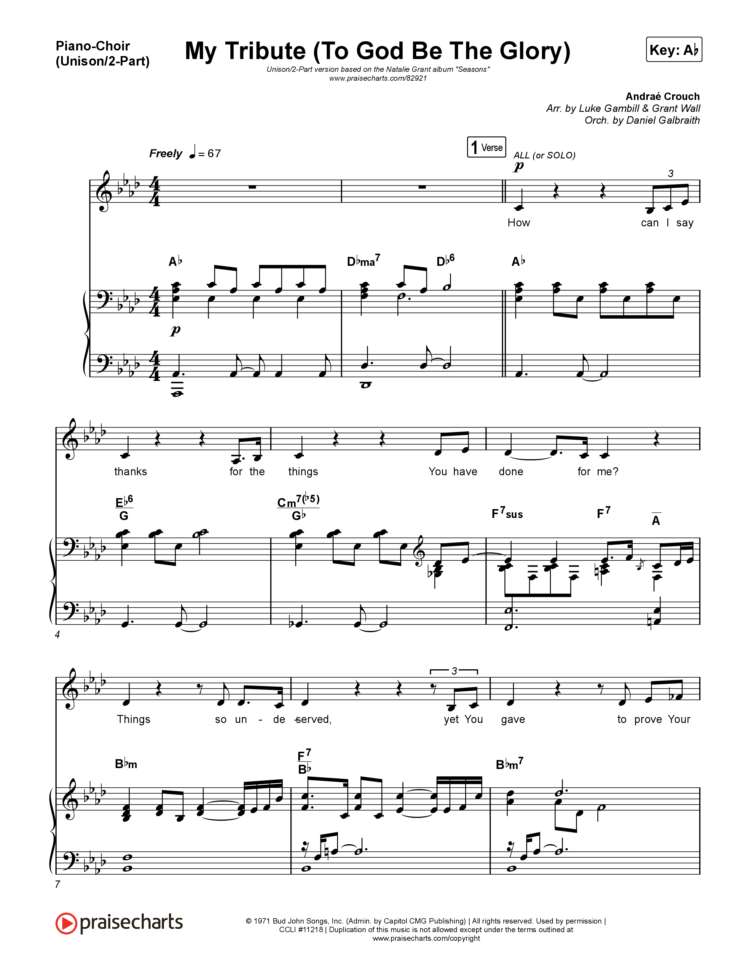 Download the PDF sheet music for My Tribute (To God Be The Glory) (Unison/2-Part) by Natalie Grant / CeCe Winans / Arr. Luke Gambill, from the album Seasons. This song was arranged by Luke Gambill / Daniel Galbraith / Grant Wall in the key of Ab.