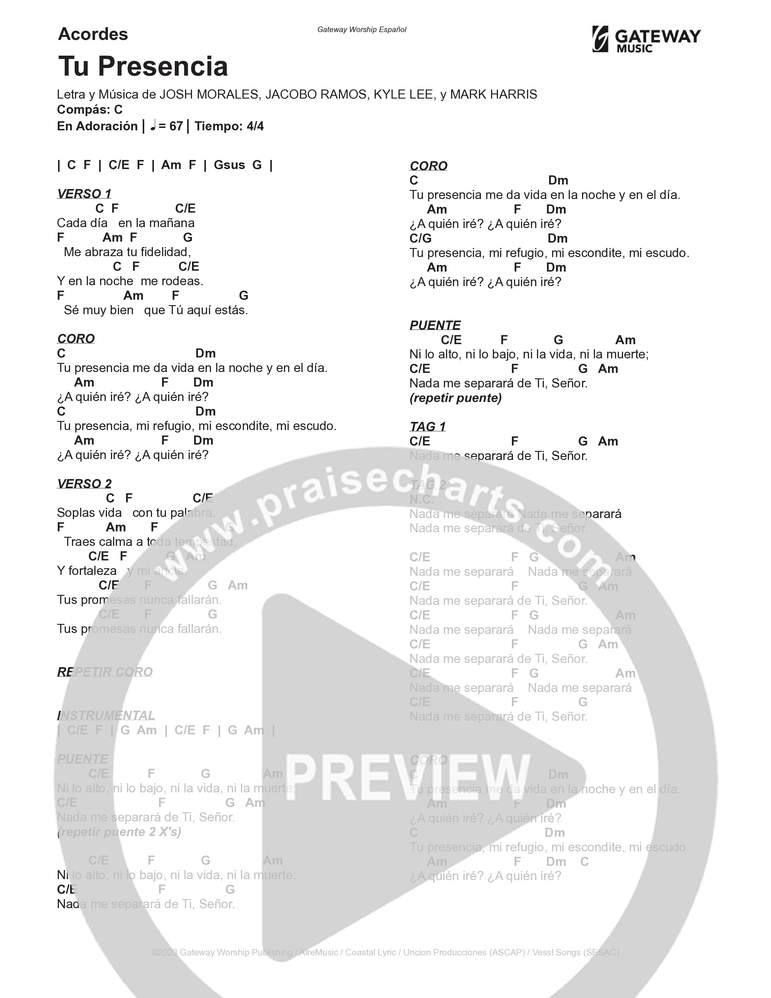 Download the PDF Chord Charts for Tu Presencia by Gateway Worship Español / Josh Morales, from the album Celebraré.