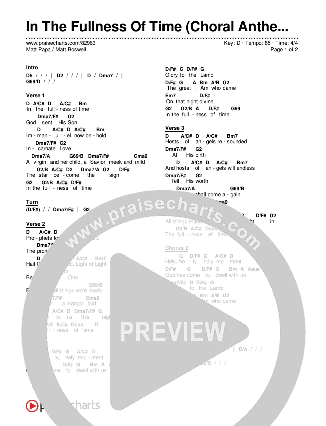 Download the PDF Chord Charts for In The Fullness Of Time (Choral Anthem SATB) by Matt Papa / Matt Boswell / Arr. Luke Gambill, from the album In The Fullness Of Time. This song was arranged by Luke Gambill / Joel Mott in the key of D.