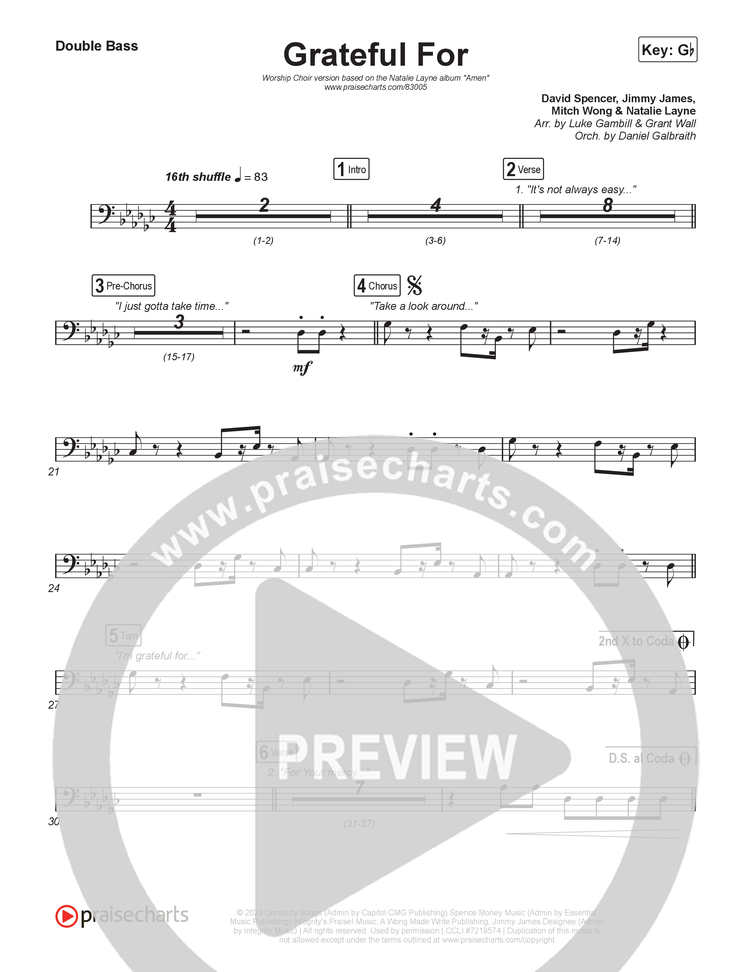 Download the String Bass sheet music for Grateful For (Worship Choir/SAB) by Natalie Layne / Arr. Luke Gambill, from the album Amen. This song was arranged by Luke Gambill / Daniel Galbraith / Grant Wall in the key of Gb.