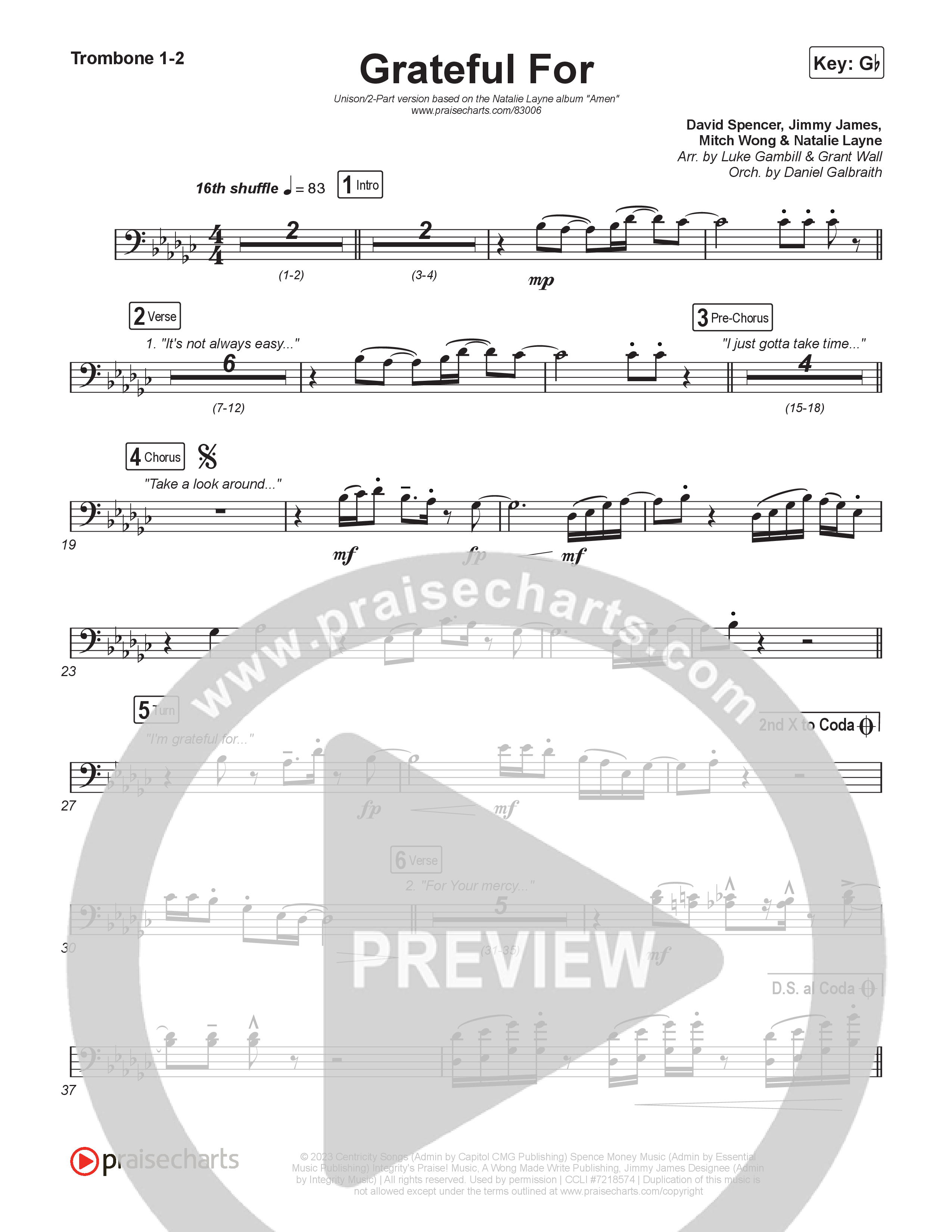 Download the Trombone 1,2 sheet music for Grateful For (Unison/2-Part) by Natalie Layne / Arr. Luke Gambill, from the album Amen. This song was arranged by Luke Gambill / Daniel Galbraith / Grant Wall in the key of Gb.
