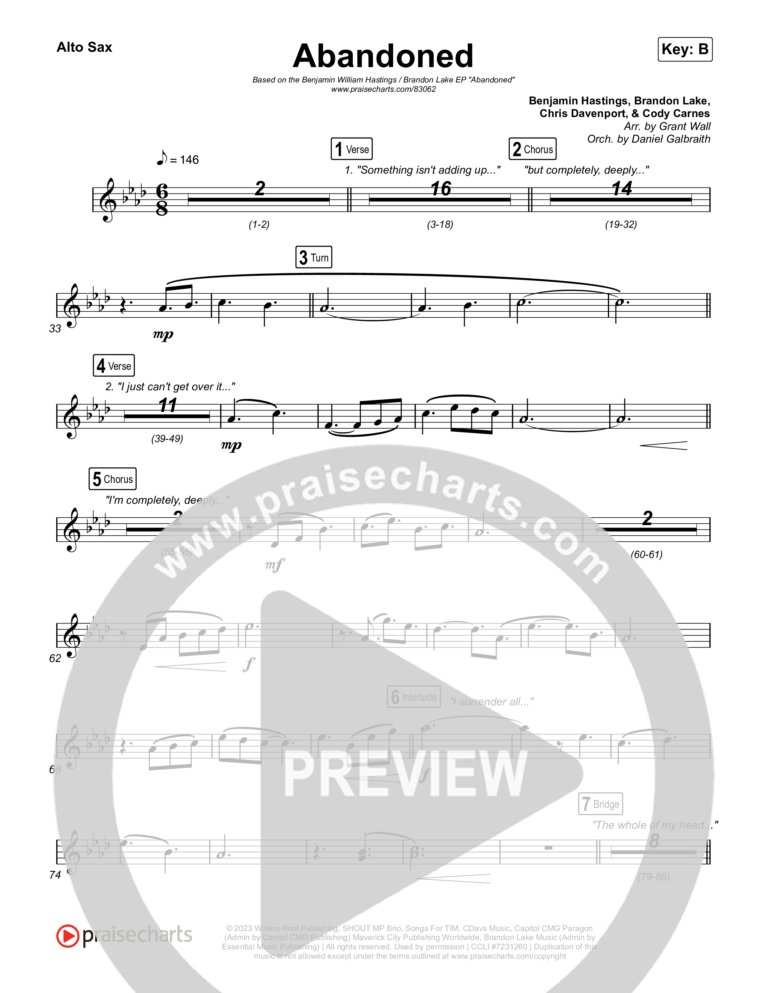 Download the AltoSax sheet music for Abandoned by Benjamin William Hastings, from the album Abandoned. This song was arranged by Grant Wall / Daniel Galbraith in the key of B, Bb.