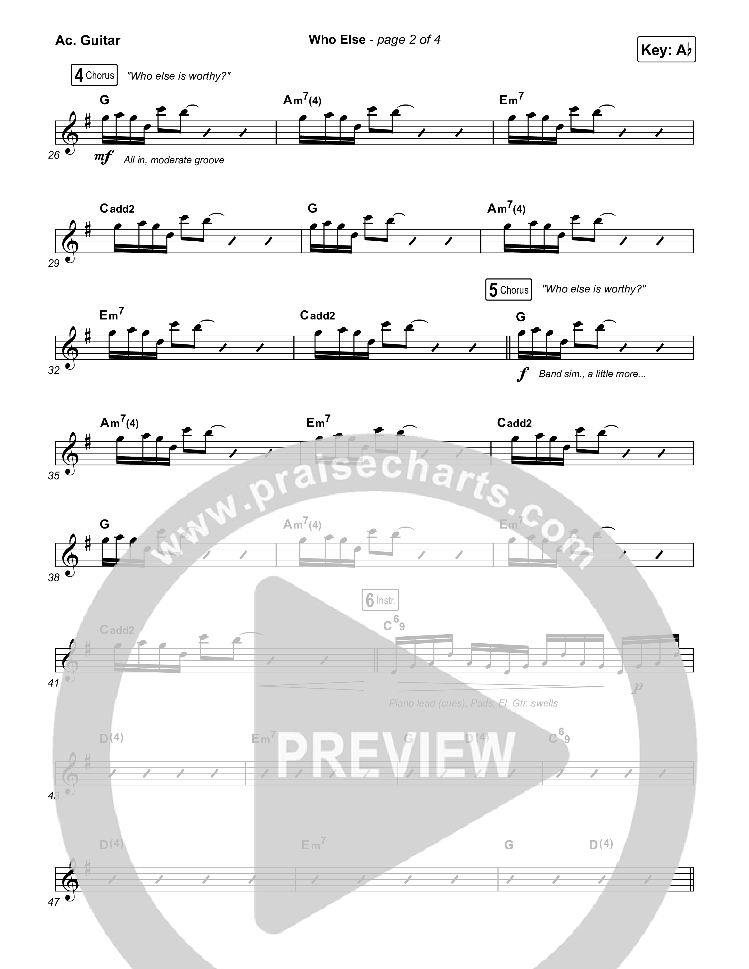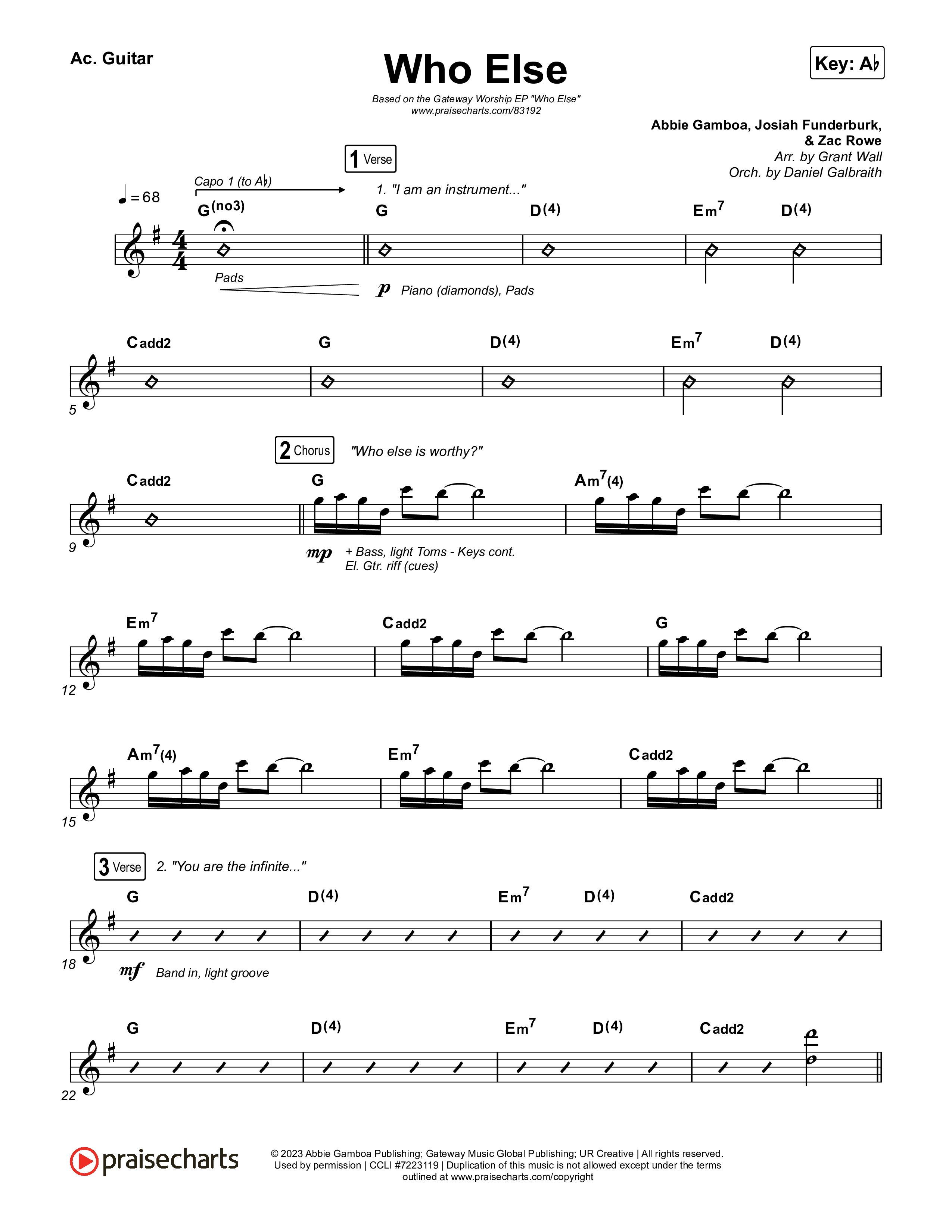 Download the Acoustic Guitar sheet music for Who Else (Live) by Gateway Worship / Abbie Gamboa, from the album Who Else EP. This song was arranged by Grant Wall / Daniel Galbraith in the key of Ab, G.
