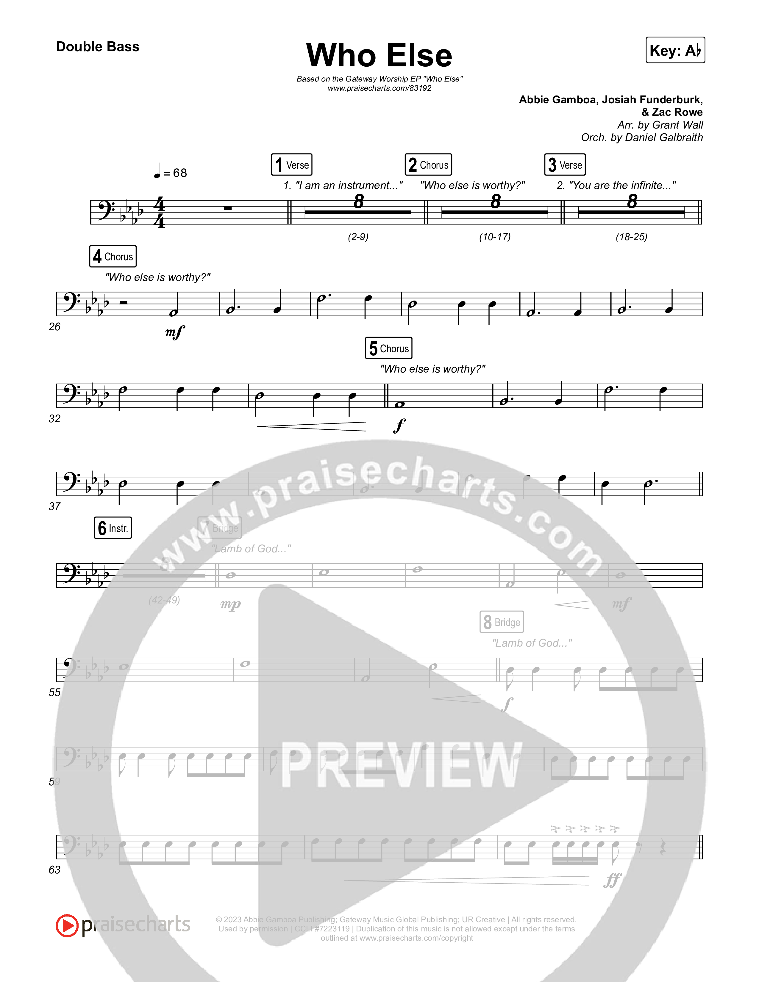 Download the String Bass sheet music for Who Else (Live) by Gateway Worship / Abbie Gamboa, from the album Who Else EP. This song was arranged by Grant Wall / Daniel Galbraith in the key of Ab, G.