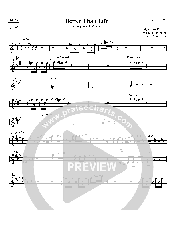 Download the Bari Sax sheet music for Better Than Life by Lakewood Church, from the album Lakewood Live: We Speak to Nations. This song was arranged by Mark Cole in the key of C, F, G.
