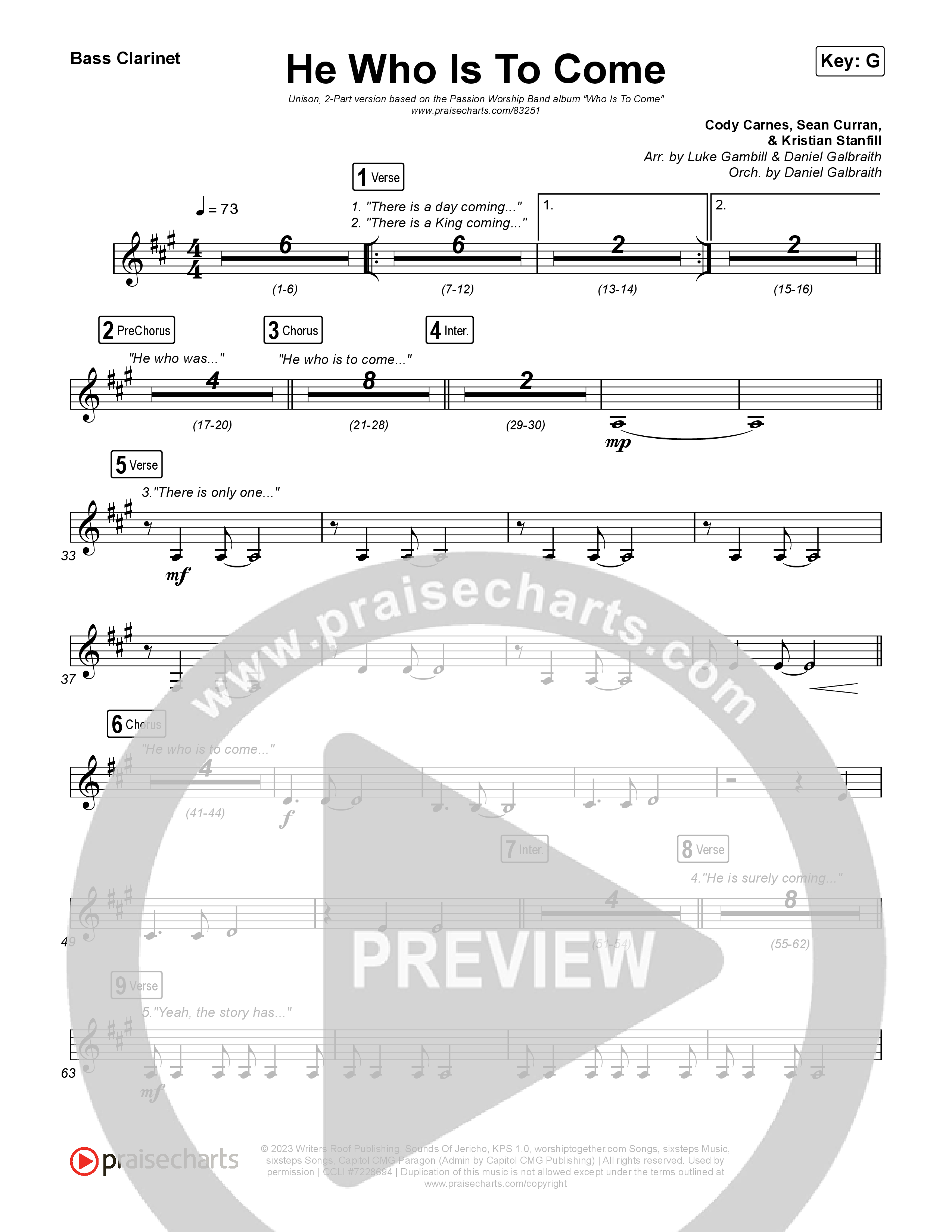 Download the Bass Clarinet sheet music for He Who Is To Come (Unison/2-Part) by Passion / Cody Carnes / Kristian Stanfill / Arr. Luke Gambill, from the album He Who Is To Come. This song was arranged by Luke Gambill / Daniel Galbraith in the key of G.