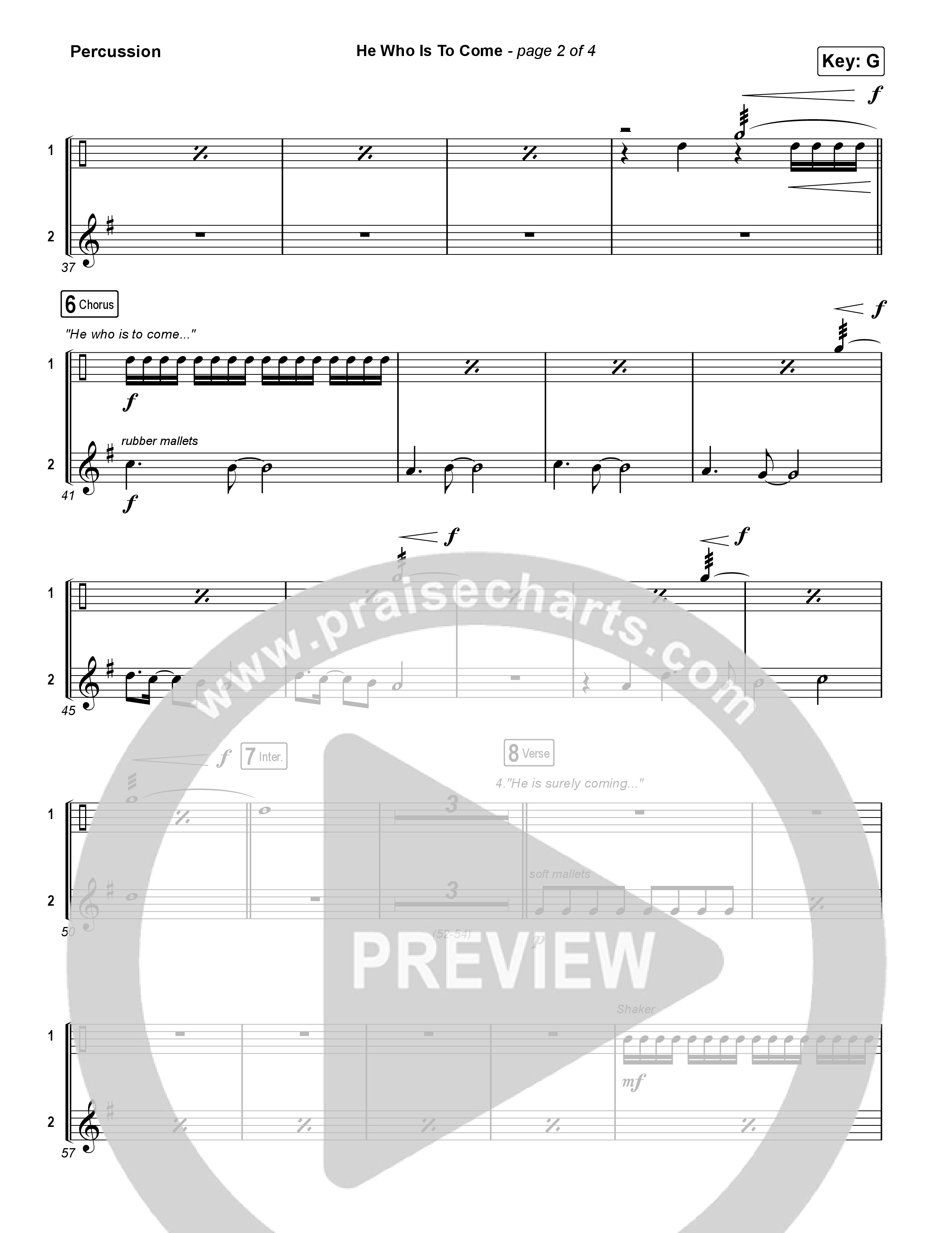 Download the percussion sheet music for He Who Is To Come (Unison/2-Part) by Passion / Cody Carnes / Kristian Stanfill / Arr. Luke Gambill, from the album He Who Is To Come. This song was arranged by Luke Gambill / Daniel Galbraith in the key of G.