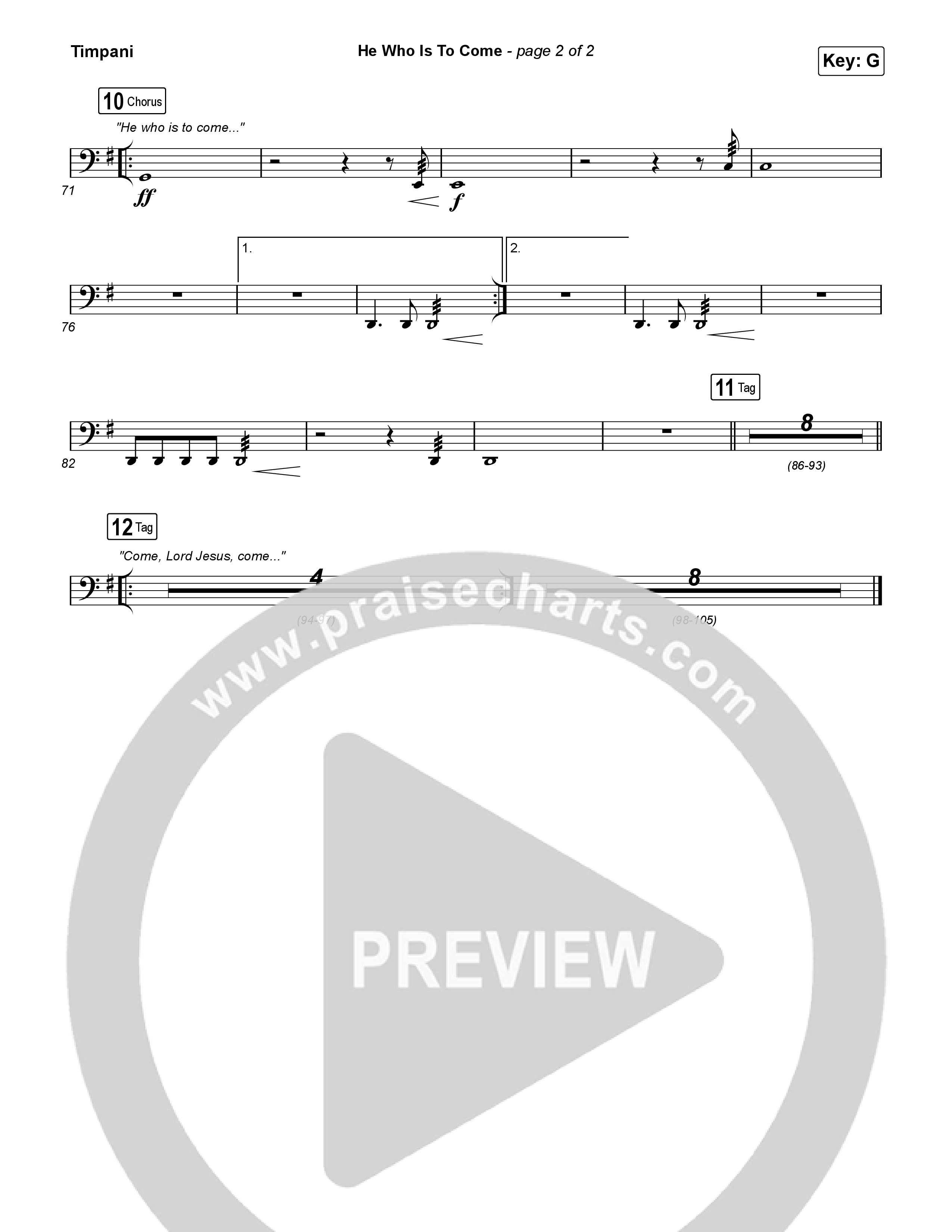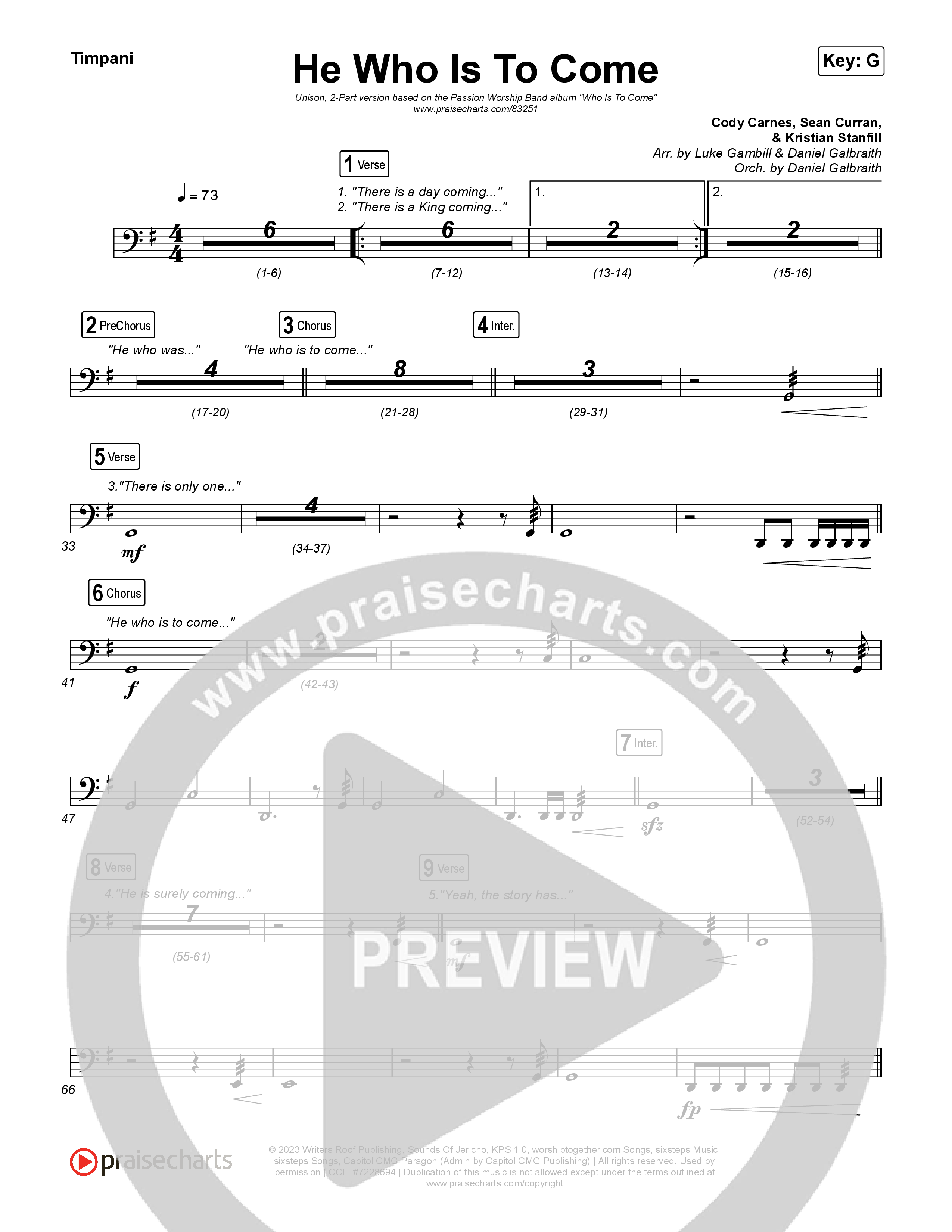 Download the Timpani sheet music for He Who Is To Come (Unison/2-Part) by Passion / Cody Carnes / Kristian Stanfill / Arr. Luke Gambill, from the album He Who Is To Come. This song was arranged by Luke Gambill / Daniel Galbraith in the key of G.