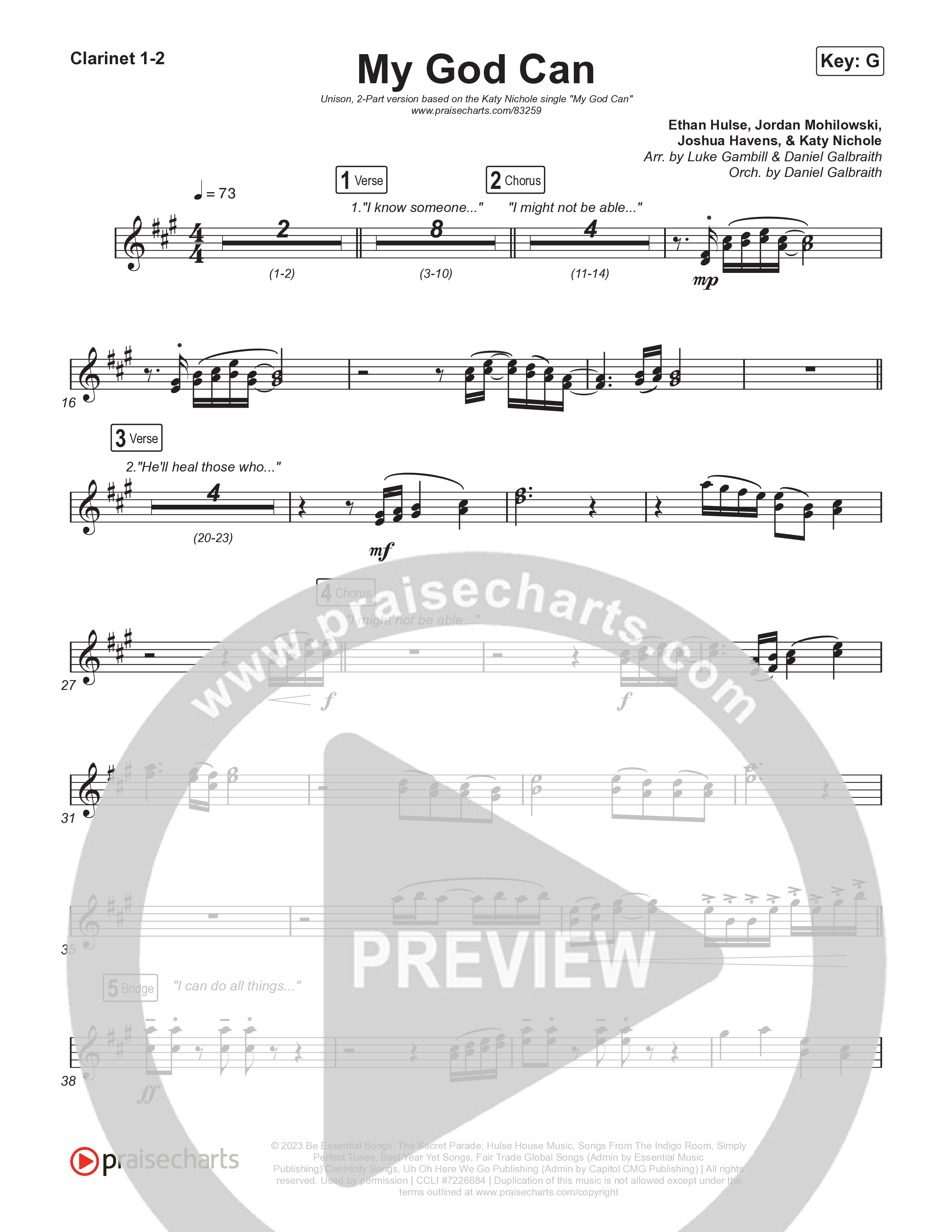 Download the Clarinet sheet music for My God Can (Unison/2-Part) by Katy Nichole / Naomi Raine / Arr. Luke Gambill, from the album My God Can. This song was arranged by Luke Gambill / Daniel Galbraith / Grant Wall in the key of G.