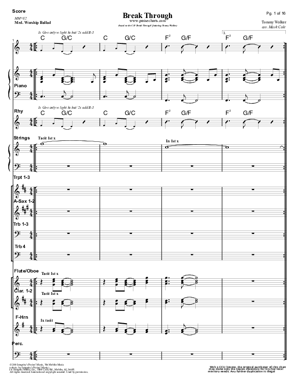 Download the Orchestration for Break Through by Tommy Walker, from the album Break Through. This song was arranged by Mark Cole in the key of Bb, C, D.