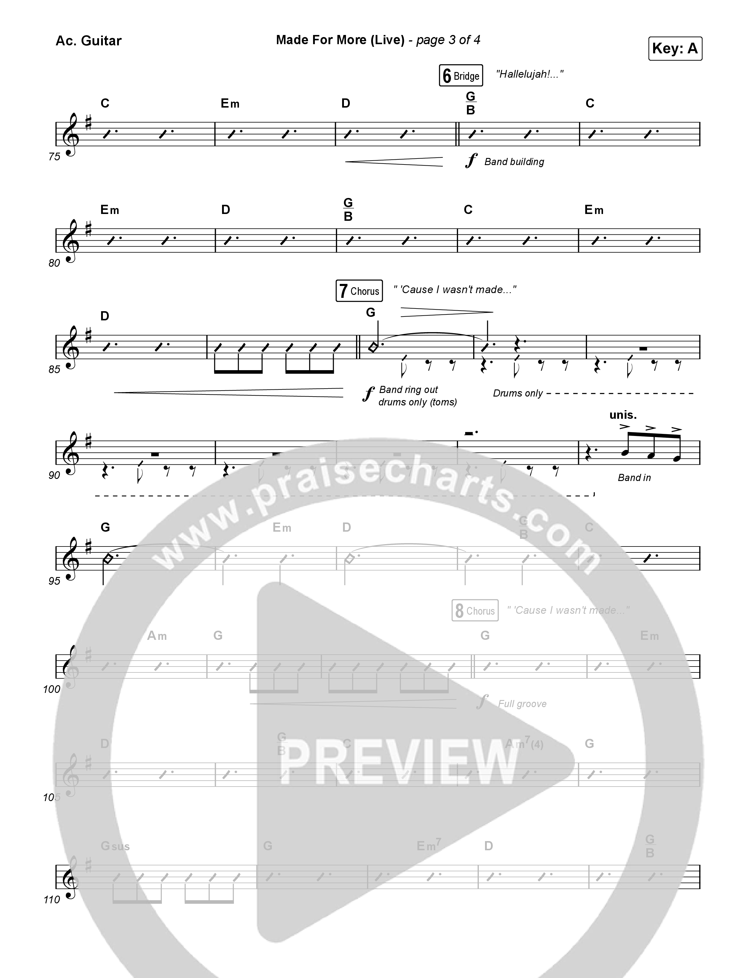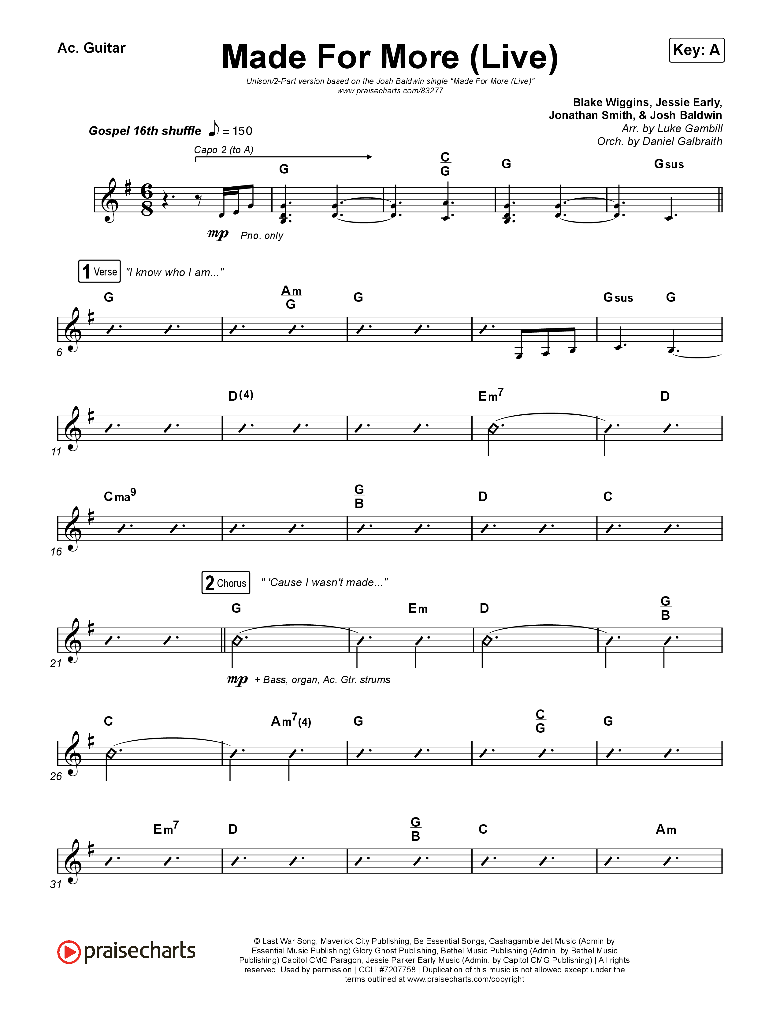 Download the Acoustic Guitar sheet music for Made For More (Unison/2-Part) by Josh Baldwin / Jenn Johnson / Arr. Luke Gambill, from the album Made For More. This song was arranged by Luke Gambill / Daniel Galbraith in the key of A.