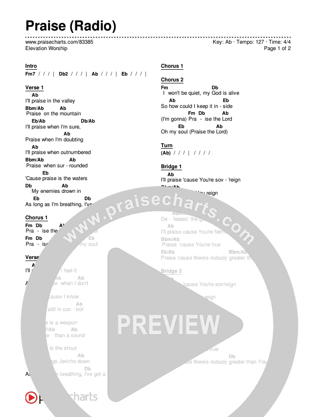Download the PDF Chord Charts for Praise (Radio) by Elevation Worship, from the album Praise EP. This song was arranged by Grant Wall / Daniel Galbraith in the key of A, Ab.