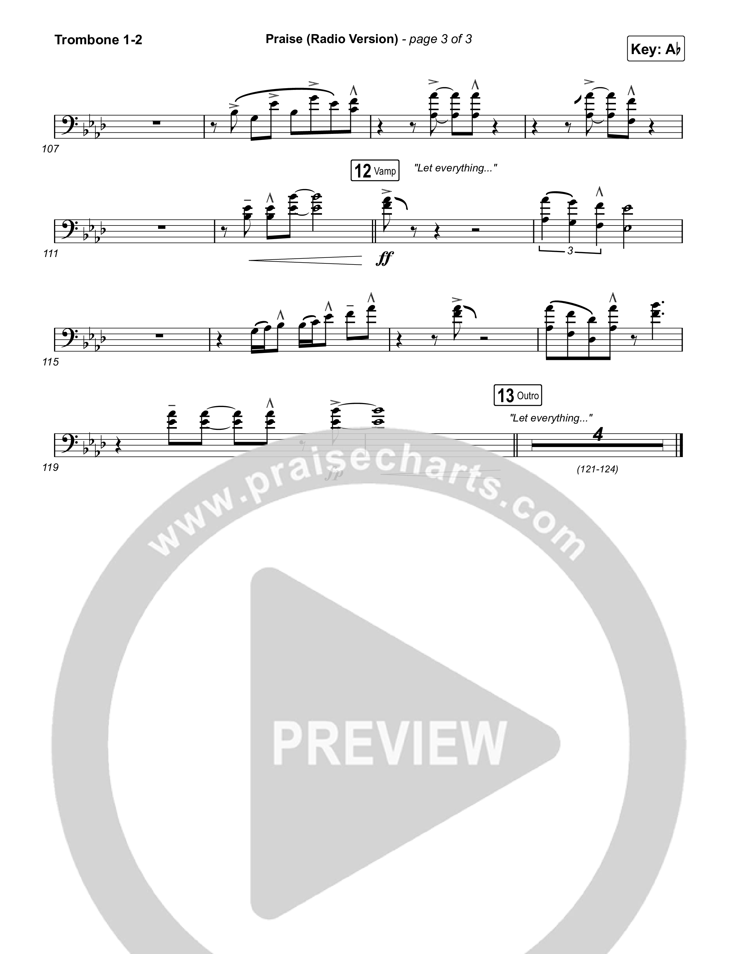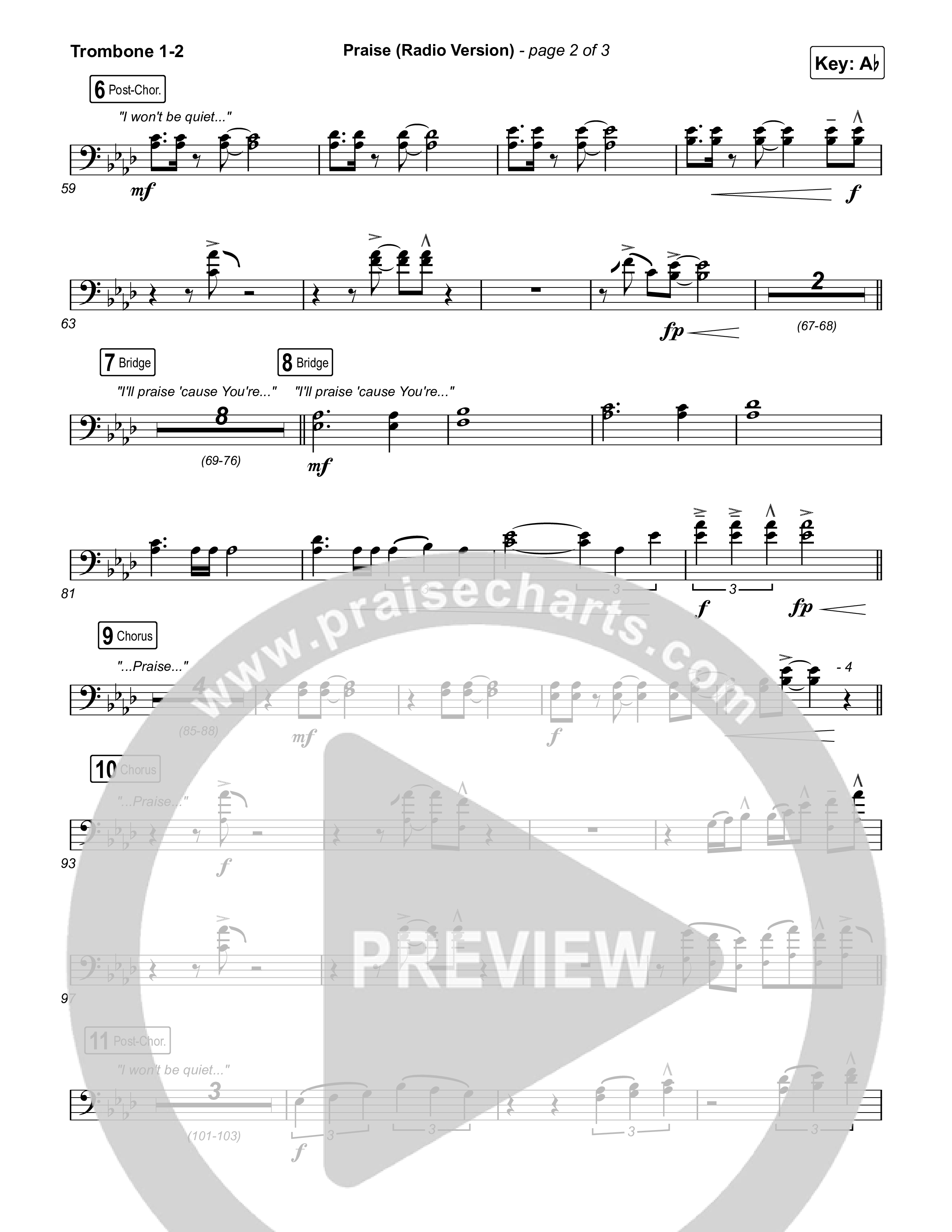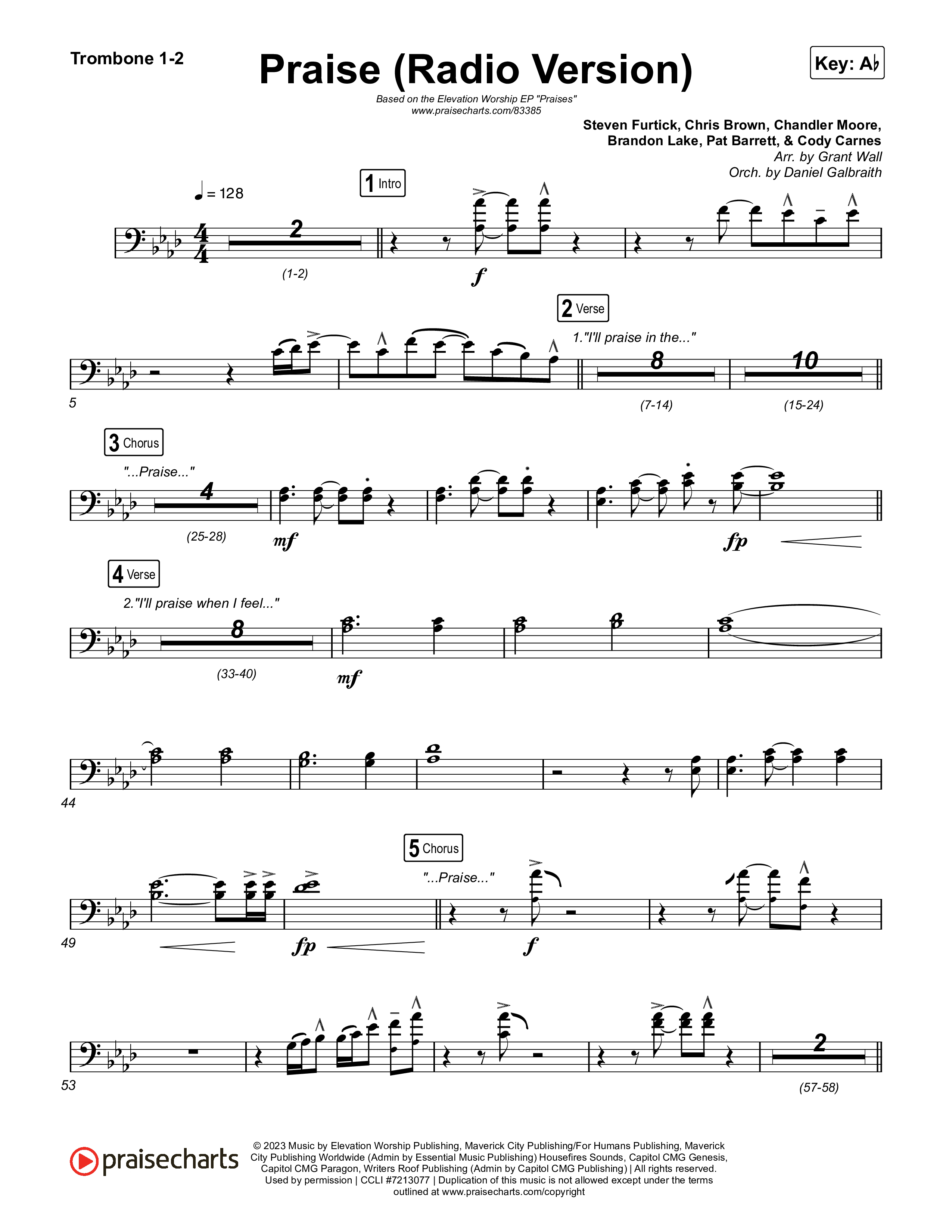 Download the Trombone 1,2 sheet music for Praise (Radio) by Elevation Worship, from the album Praise EP. This song was arranged by Grant Wall / Daniel Galbraith in the key of A, Ab.