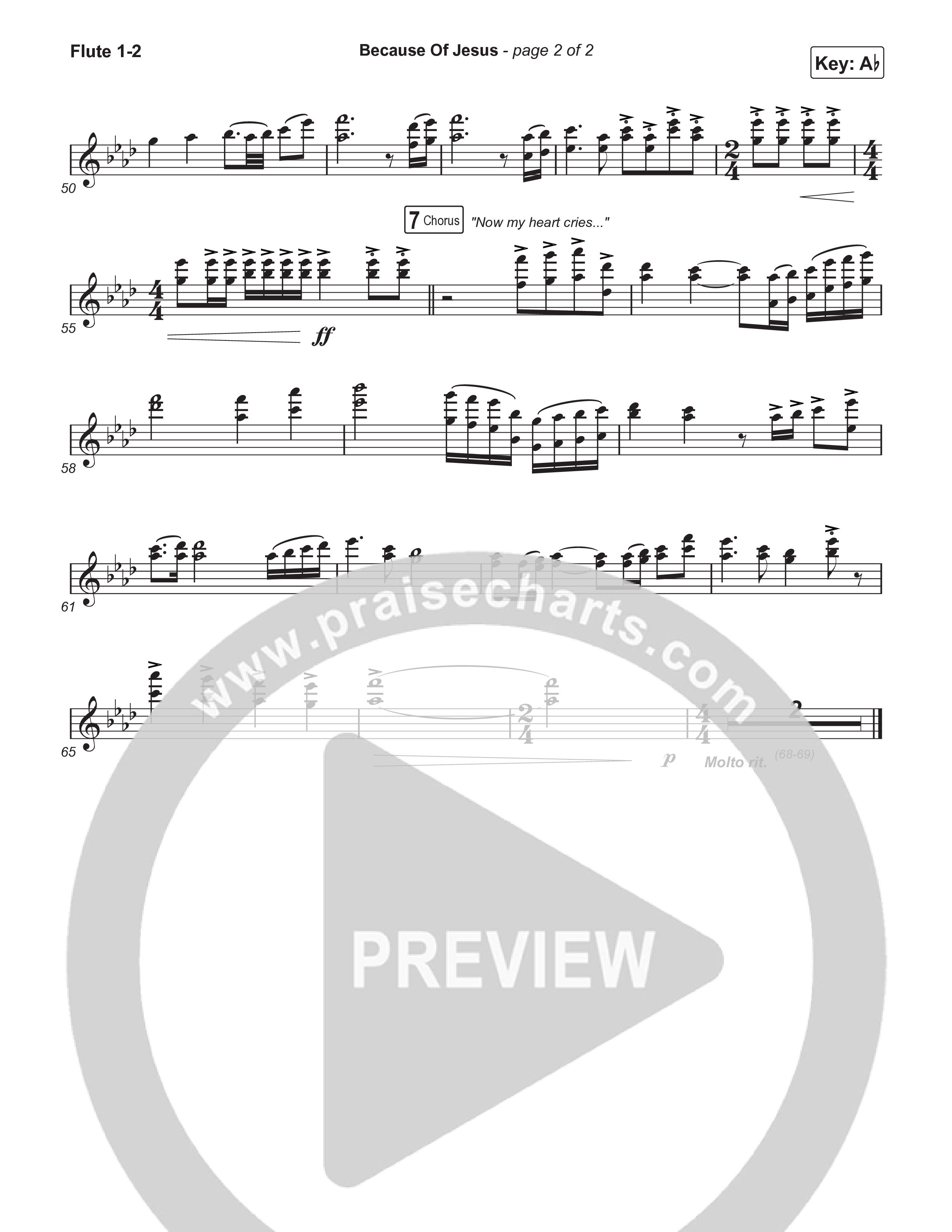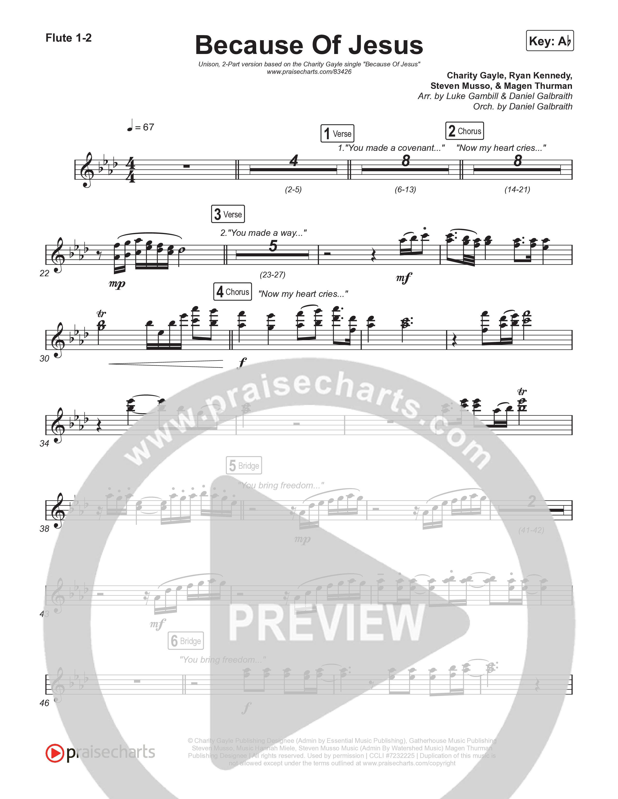 Download the Flute sheet music for Because Of Jesus (Unison/2-Part) by Charity Gayle / Arr. Luke Gambill, from the album Because Of Jesus. This song was arranged by Luke Gambill / Daniel Galbraith in the key of Ab.