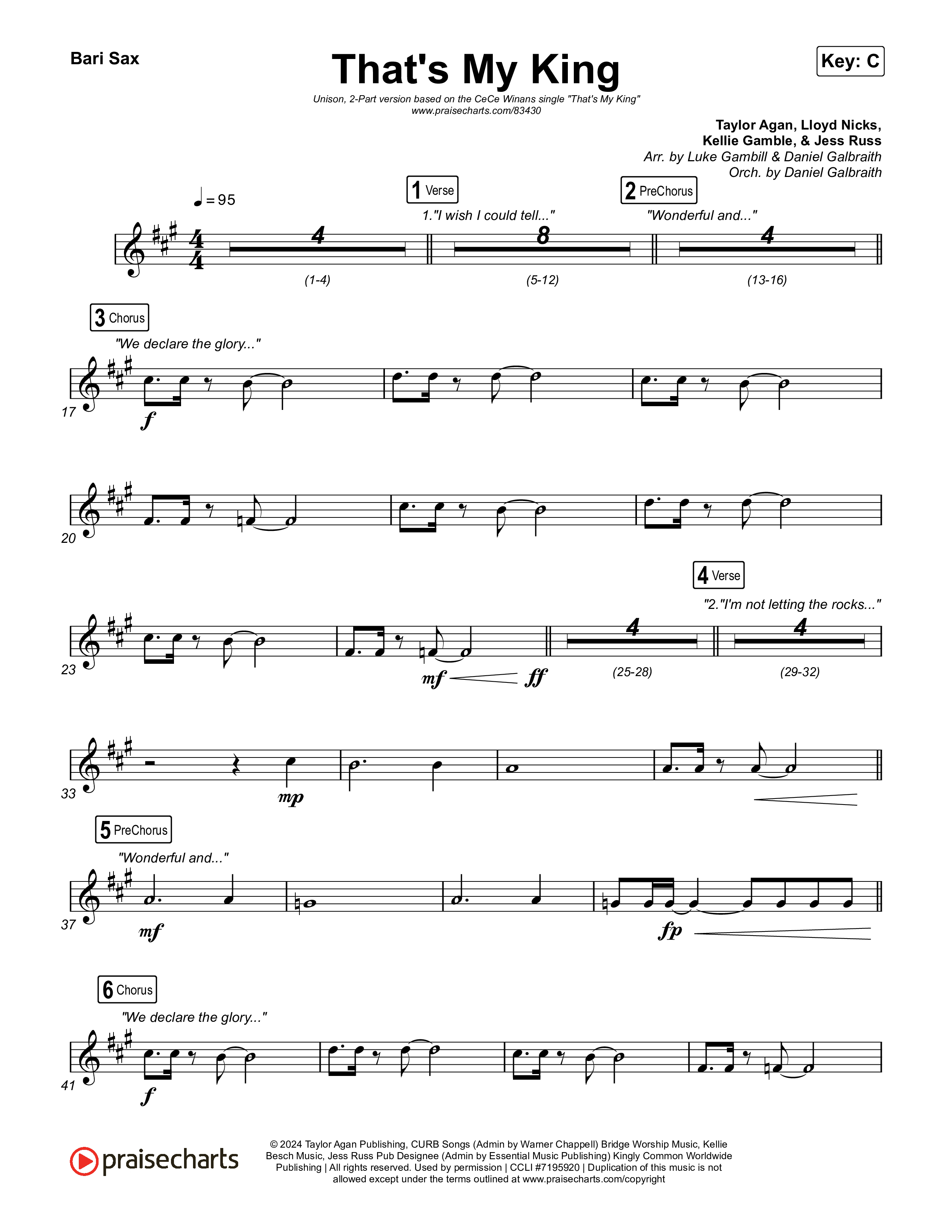 Download the Bari Sax sheet music for That's My King (Unison/2-Part) by CeCe Winans / Arr. Luke Gambill, from the album That's My King. This song was arranged by Luke Gambill in the key of C.