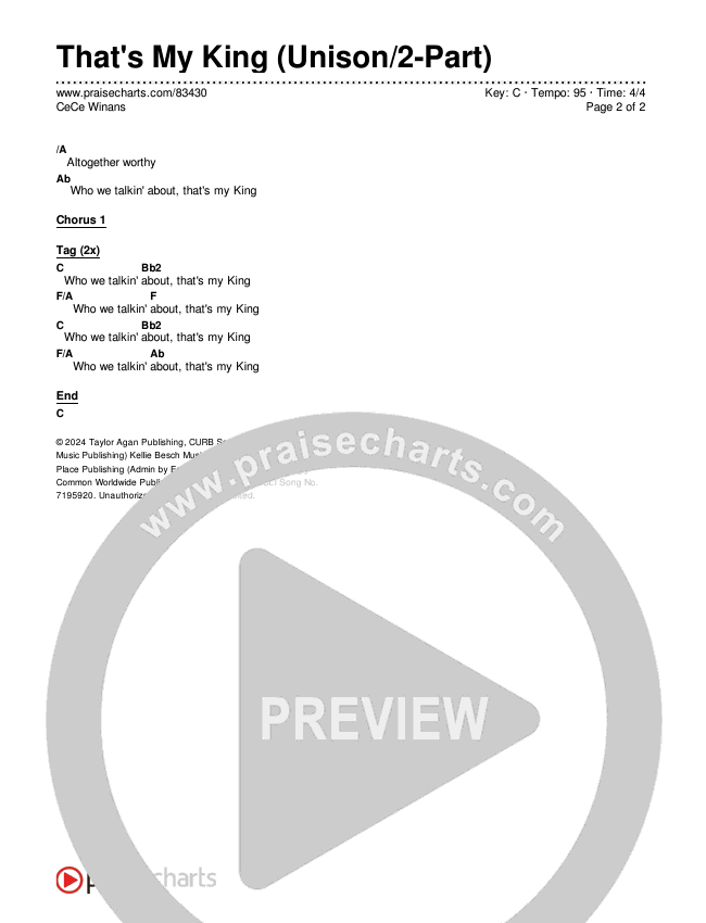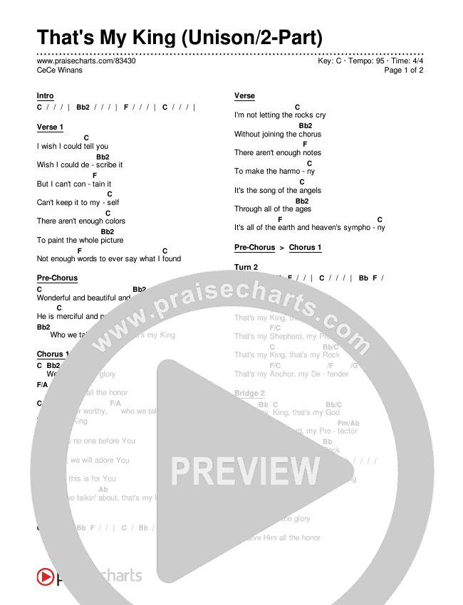 Download the PDF Chord Charts for That's My King (Unison/2-Part) by CeCe Winans / Arr. Luke Gambill, from the album That's My King. This song was arranged by Luke Gambill in the key of C.