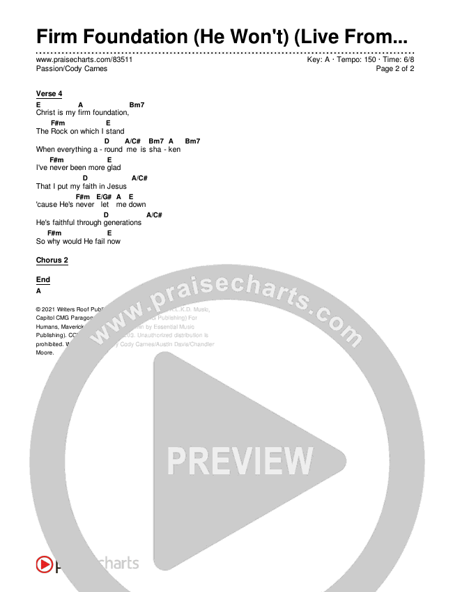 Download the PDF Chord Charts for Firm Foundation (He Won't) (Live From Passion 2024) by Passion / Cody Carnes, from the album Call On Heaven (Live From Passion 2024).