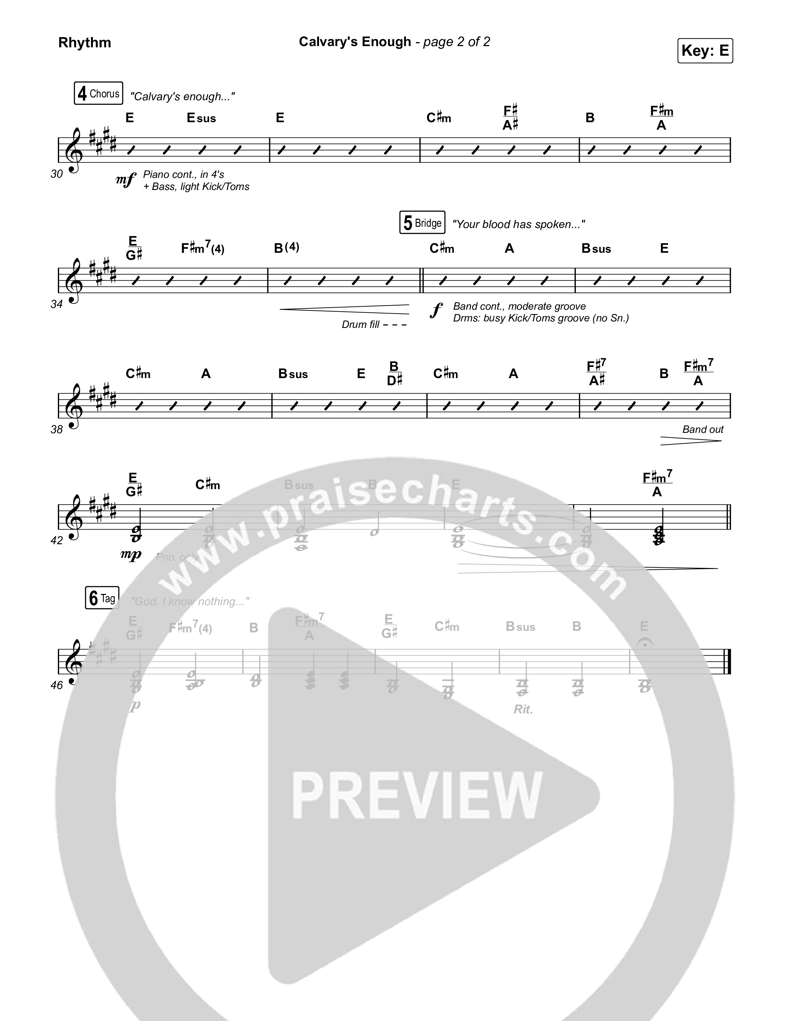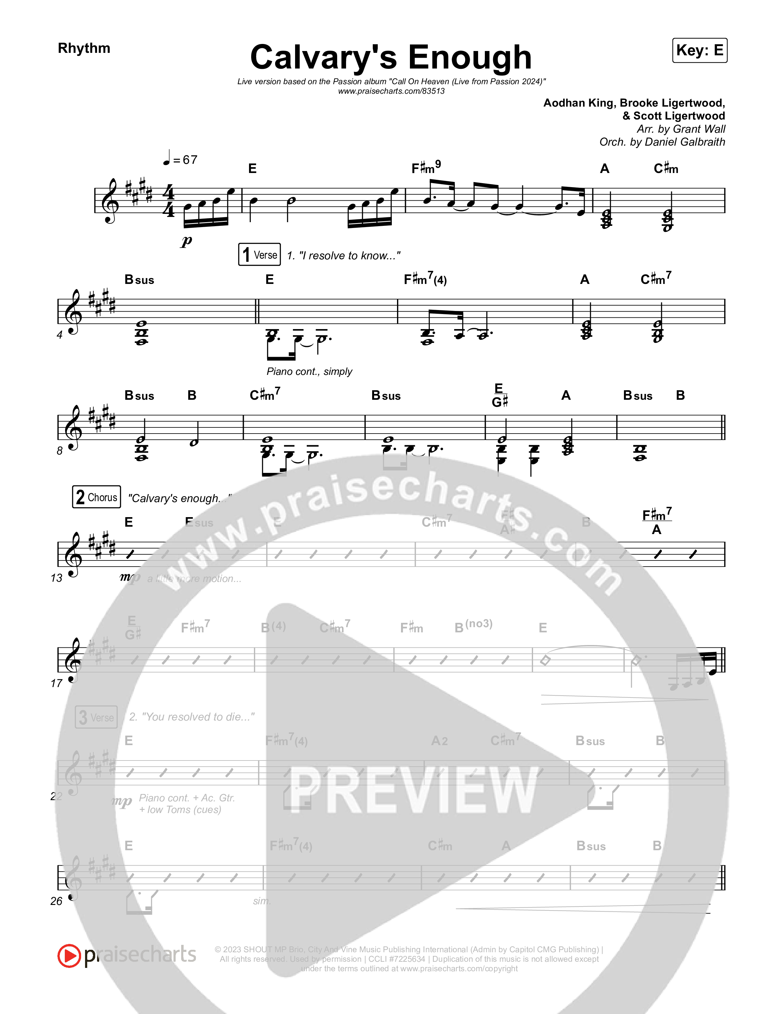 Download the Rhythm Chart for Calvary's Enough (Live From Passion 2024) by Passion / Brooke Ligertwood, from the album Call On Heaven (Live From Passion 2024). This song was arranged by Daniel Galbraith in the key of E, F.