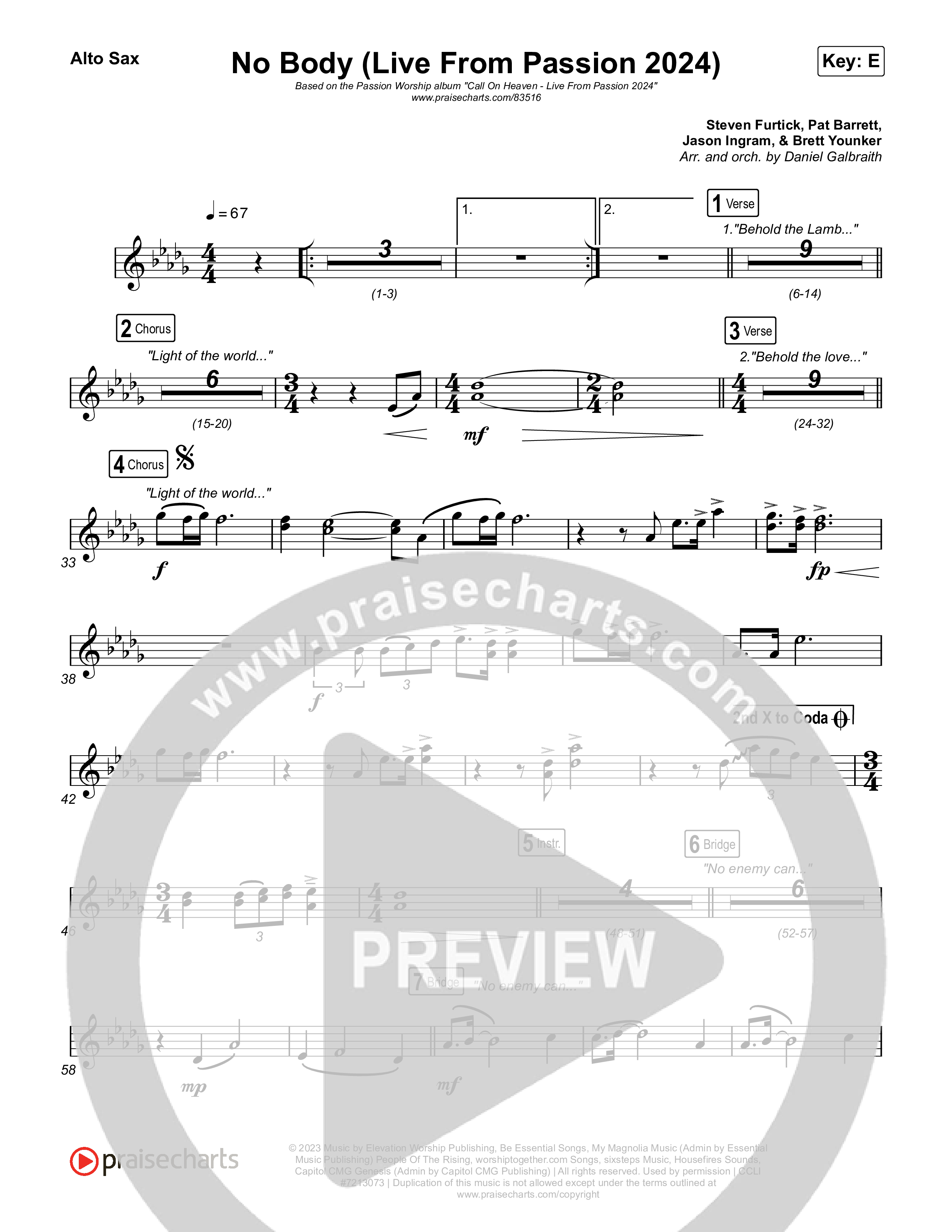 Download the AltoSax sheet music for No Body (Live From Passion 2024) by Passion / Chidima, from the album Call On Heaven (Live From Passion 2024). This song was arranged by Daniel Galbraith in the key of E, F.