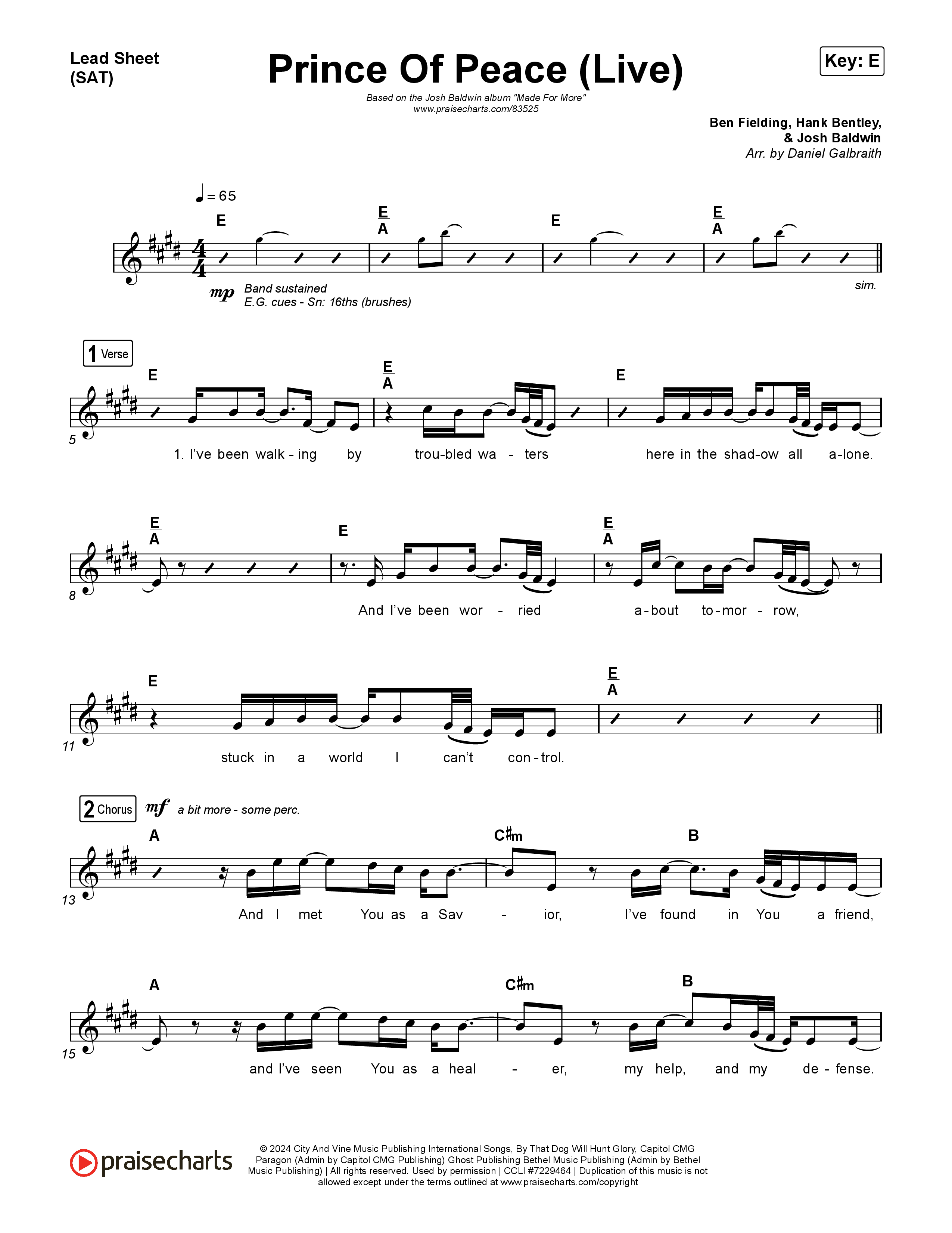 Download the sheet music for Prince Of Peace (Live) by Josh Baldwin, from the album Made For More. This song was arranged by Daniel Galbraith in the key of E, Eb.