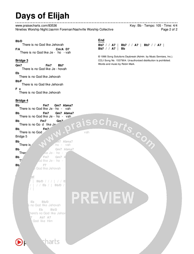 Download the PDF Chord Charts for Days of Elijah by Nineties Worship Night / Jasmin Foreman / Nashville Worship Collective, from the album Break Through The Stars.