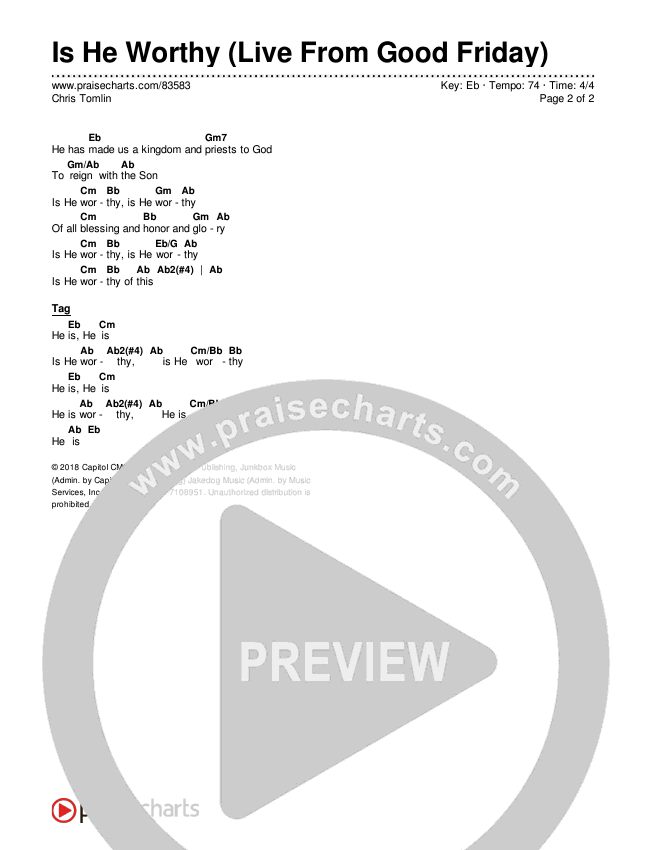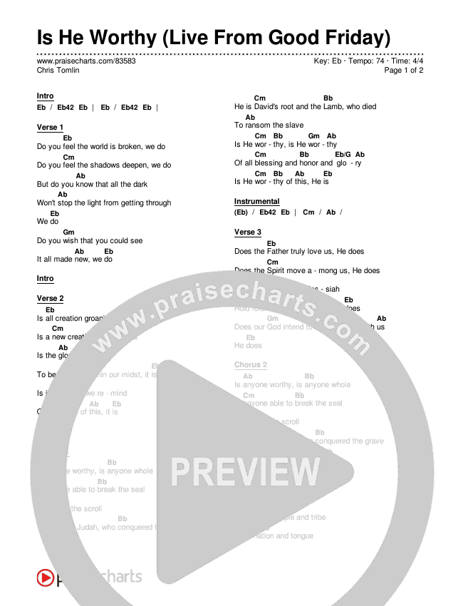 Download the PDF Chord Charts for Is He Worthy (Live From Good Friday) by Chris Tomlin, from the album Live From Good Friday.