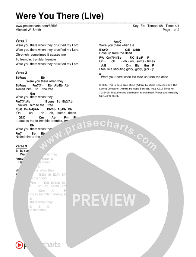 Download the PDF Chord Charts for Were You There (Live) by Michael W. Smith, from the album Worthy Is The Lamb. This song was arranged by Daniel Galbraith in the key of D, Eb.