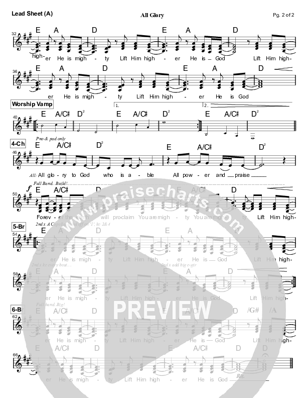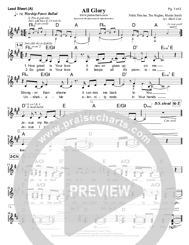 Download the sheet music for All Glory by Worship Central, from the album Spirit Break Out. This song was arranged by Mark Cole in the key of A, C.