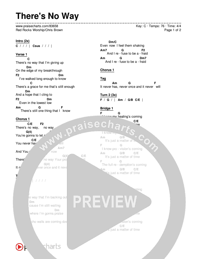 Download the PDF Chord Charts for There's No Way by Red Rocks Worship / Chris Brown, from the album There's No Way. This song was arranged by Daniel Galbraith in the key of Bb, C.