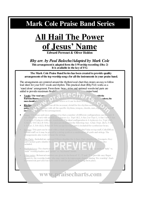 Download the Orchestration for All Hail The Power Of Jesus Name by Paul Baloche, from the album Light The Nation With Prayer. This song was arranged by Mark Cole in the key of F.