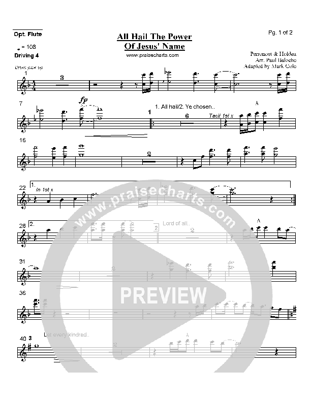 Download the Flute sheet music for All Hail The Power Of Jesus Name by Paul Baloche, from the album Light The Nation With Prayer. This song was arranged by Mark Cole in the key of F.