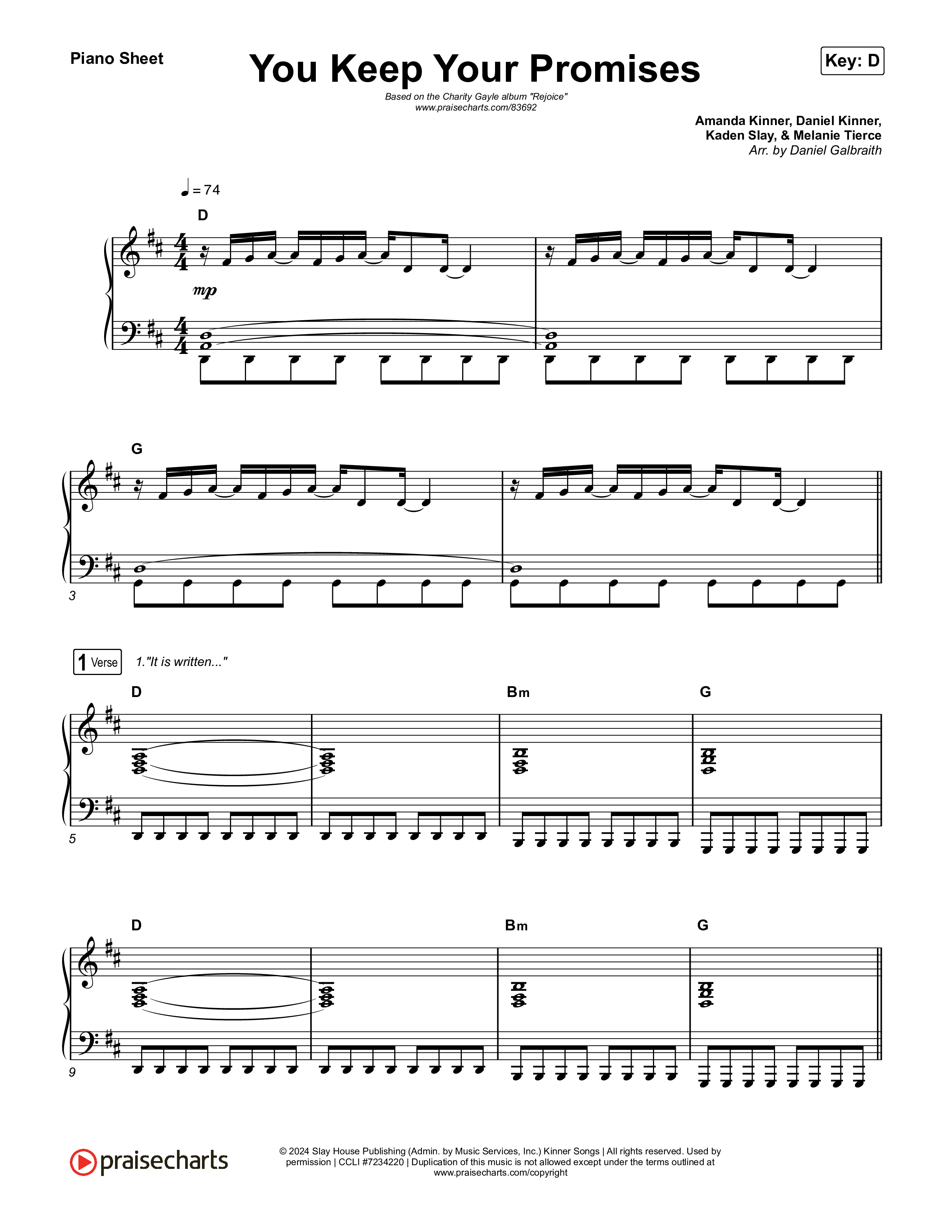 Download the piano sheet for You Keep Your Promises by Charity Gayle, from the album Rejoice. This song was arranged by Daniel Galbraith in the key of D.