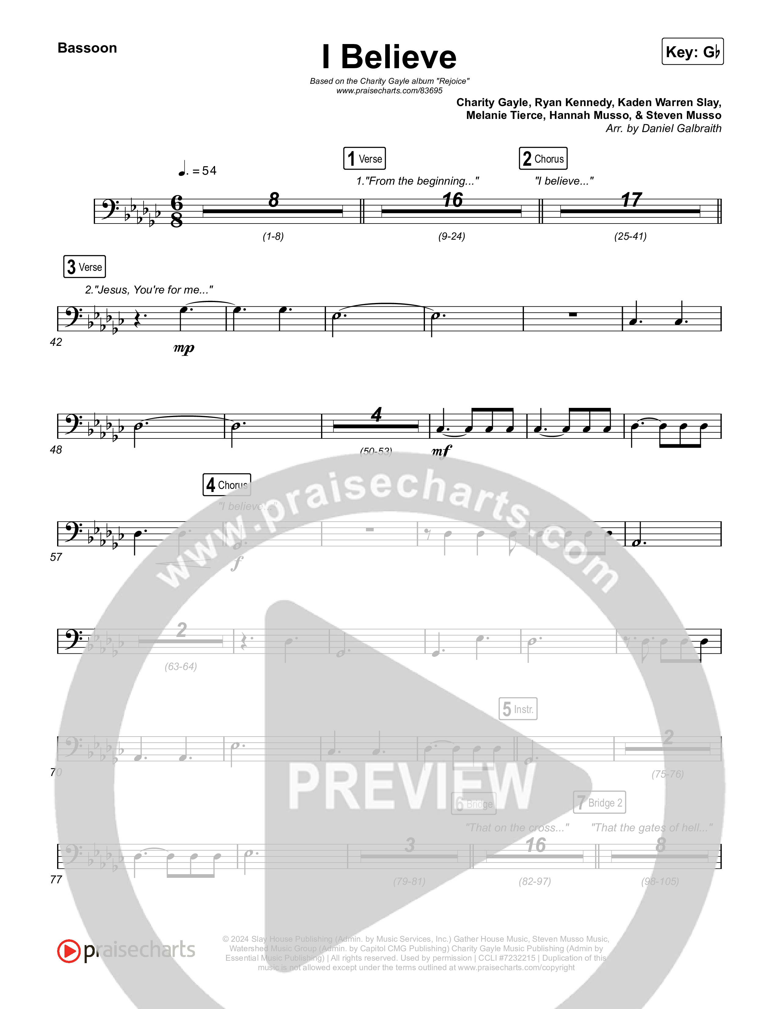 Download the Bassoon sheet music for I Believe by Charity Gayle, from the album Rejoice. This song was arranged by Daniel Galbraith in the key of F, G, Gb.