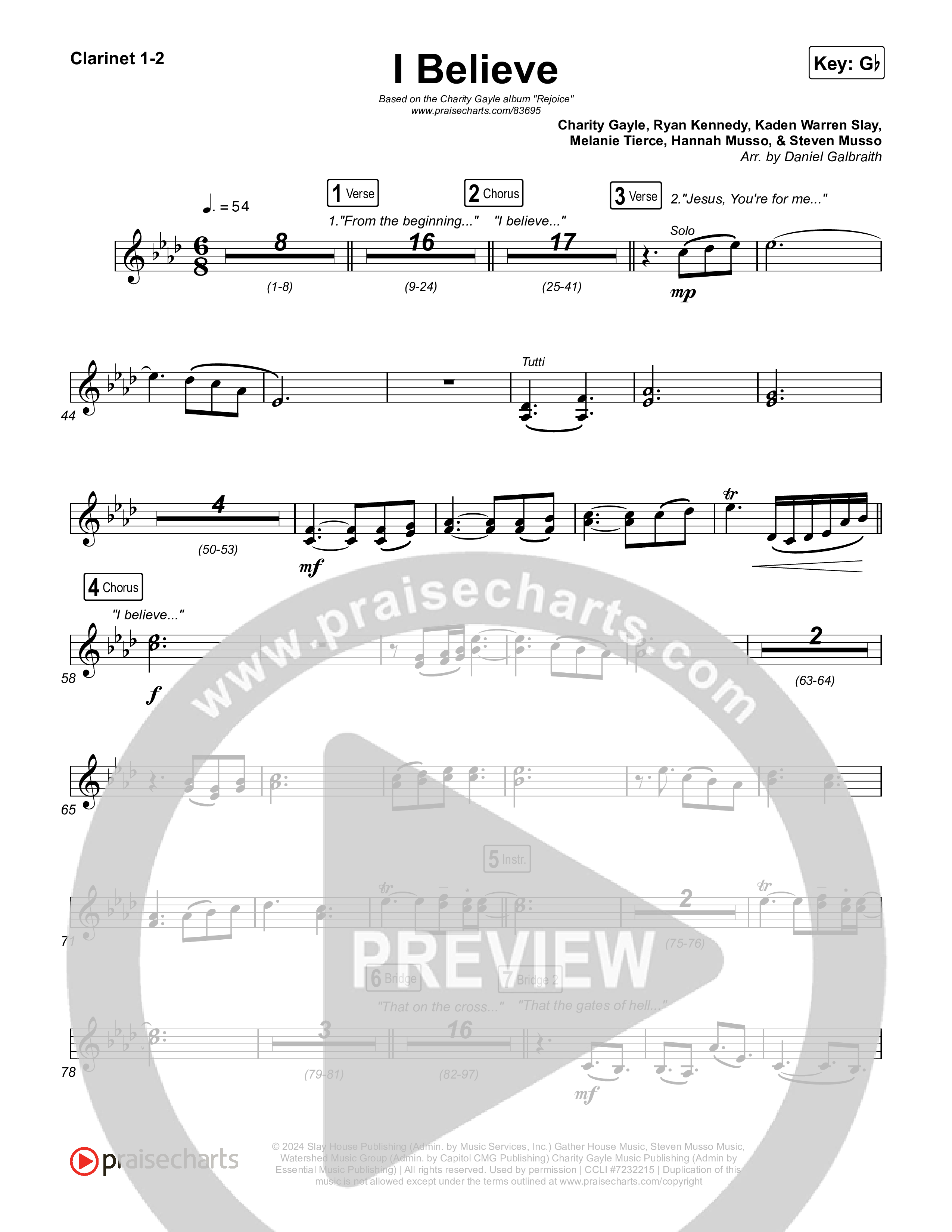 Download the Clarinet sheet music for I Believe by Charity Gayle, from the album Rejoice. This song was arranged by Daniel Galbraith in the key of F, G, Gb.