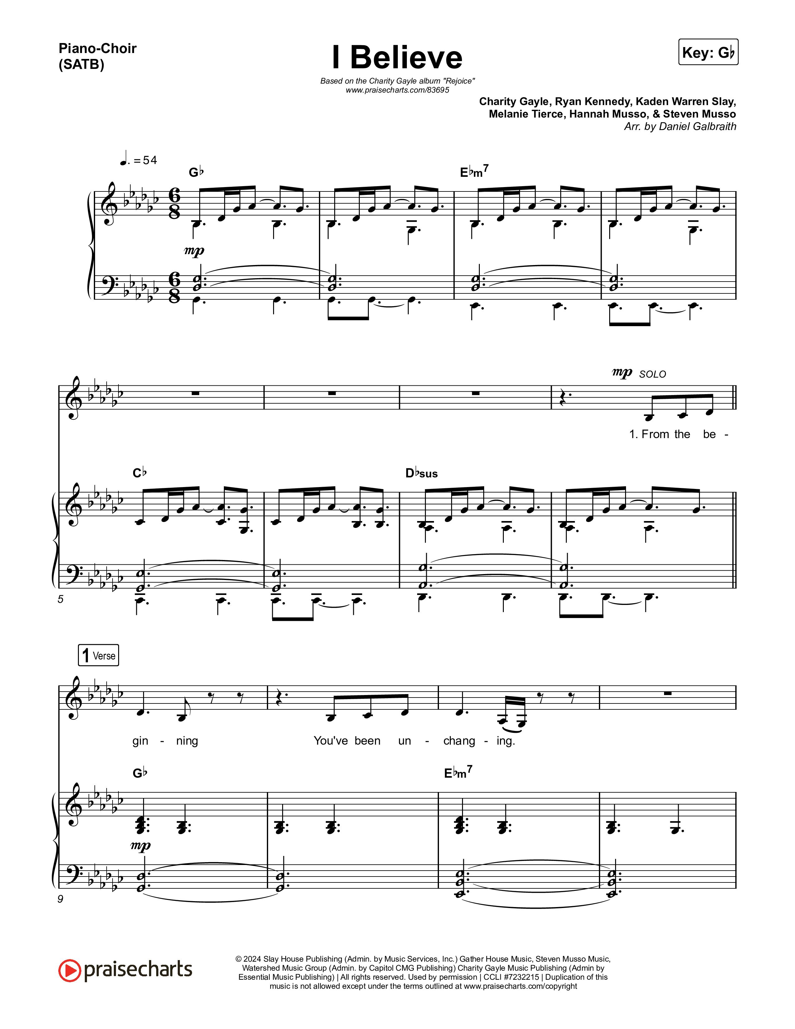 Download the sheet music for I Believe by Charity Gayle, from the album Rejoice. This song was arranged by Daniel Galbraith in the key of F, G, Gb.