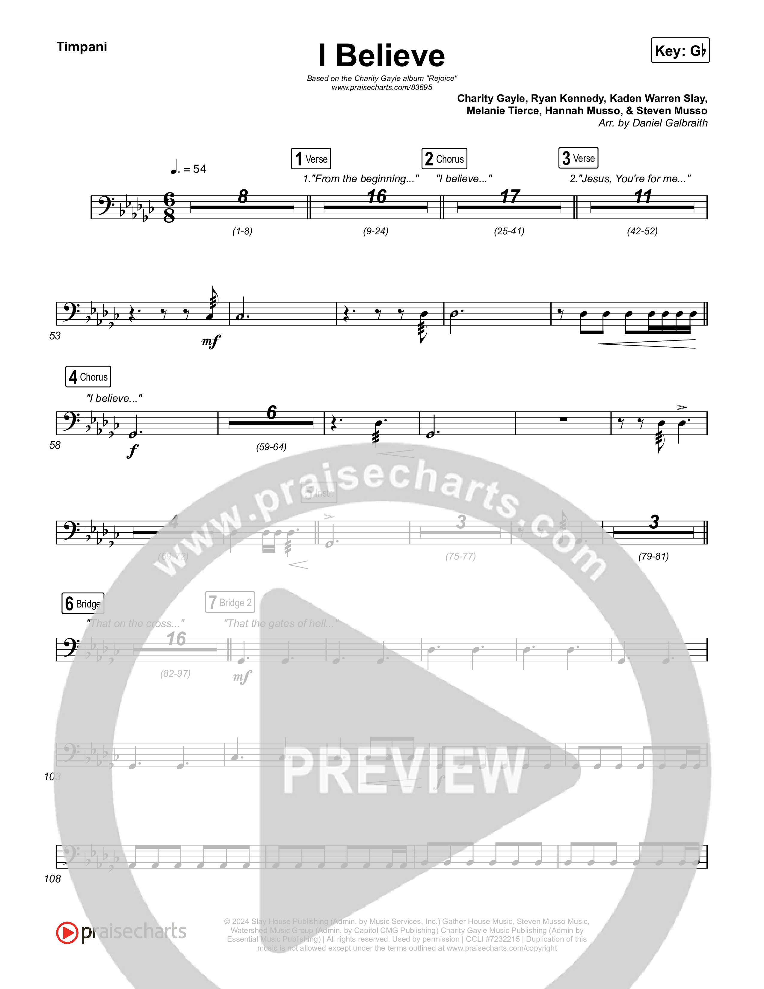 Download the Timpani sheet music for I Believe by Charity Gayle, from the album Rejoice. This song was arranged by Daniel Galbraith in the key of F, G, Gb.