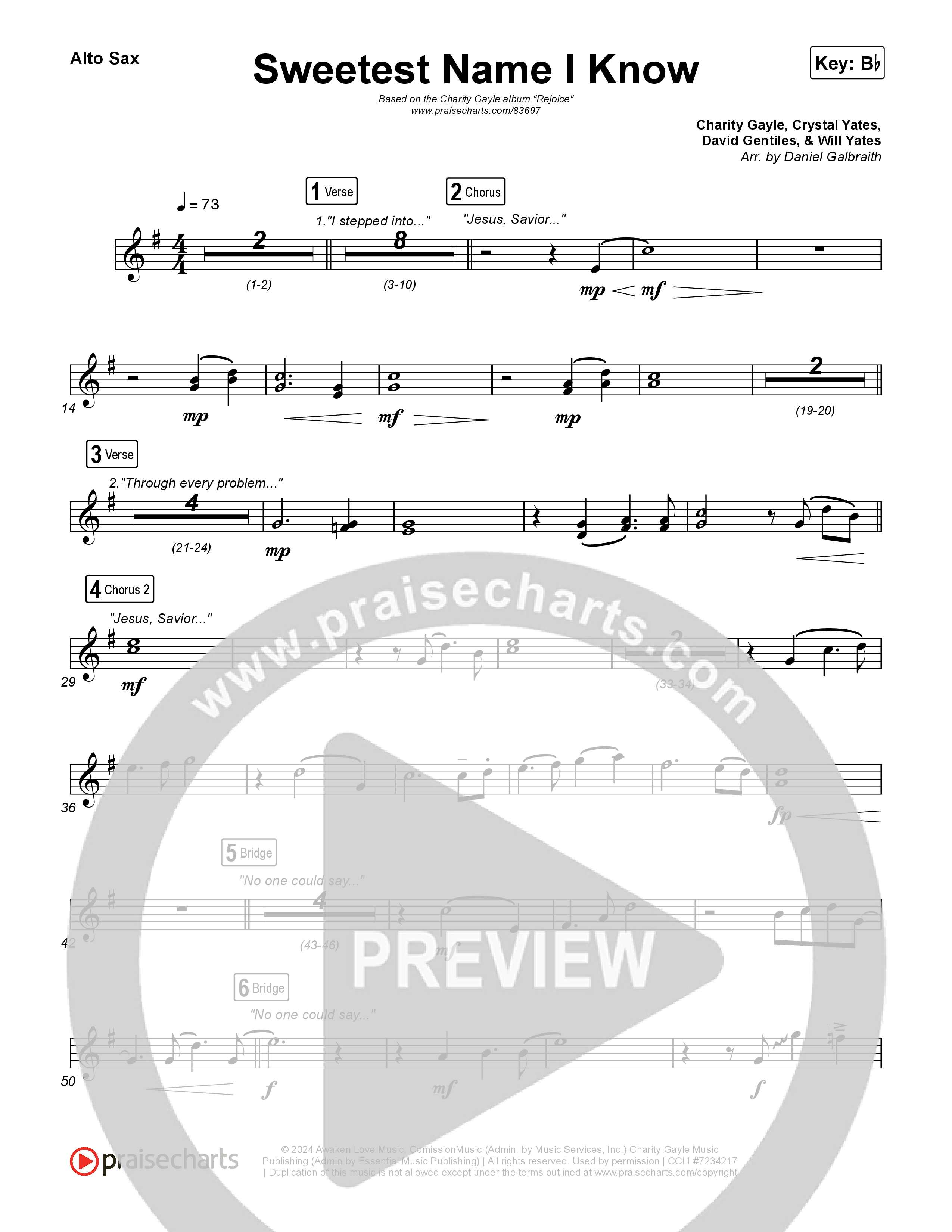 Download the AltoSax sheet music for Sweetest Name I Know by Charity Gayle, from the album Rejoice. This song was arranged by Daniel Galbraith in the key of A, Bb.