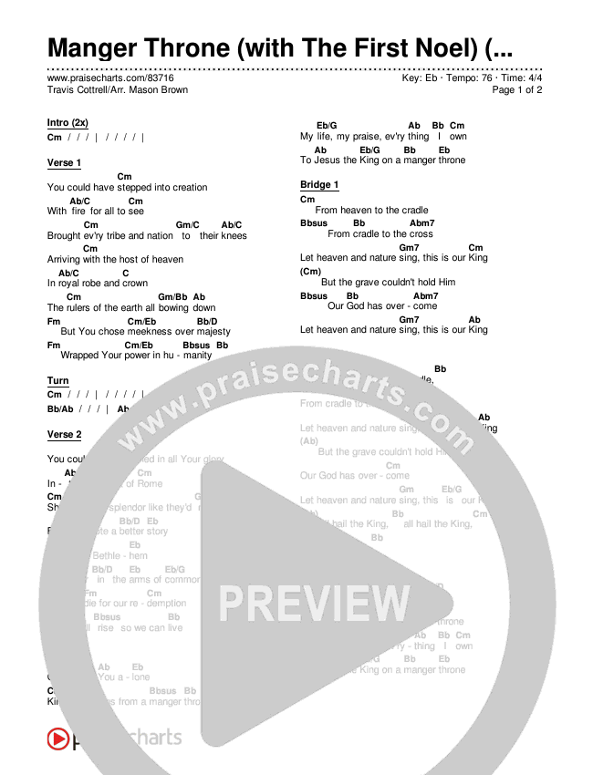 Download the PDF Chord Charts for Manger Throne (with The First Noel) (Choral/SATB) by Travis Cottrell / Arr. Mason Brown, from the album Before The Manger. This song was arranged by Travis Cottrell / Mason Brown in the key of Eb.