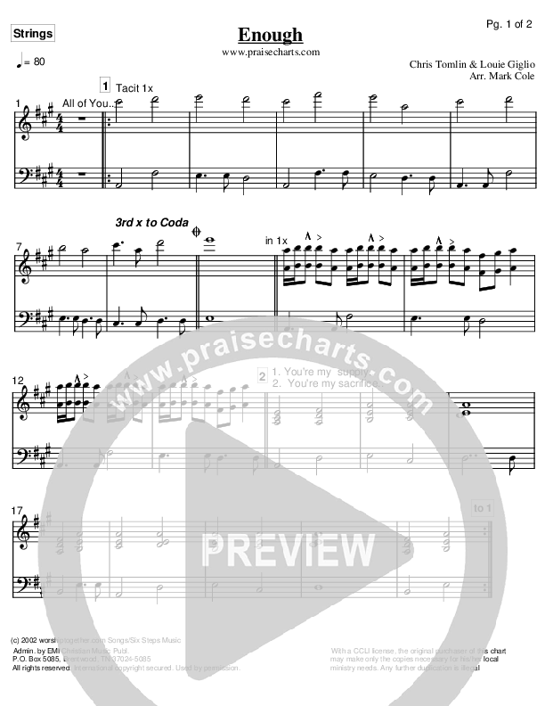Download the Orchestration for Enough by Chris Tomlin, from the album Here I Am To Worship (Vol. 1). This song was arranged by Mark Cole in the key of A, E, G.