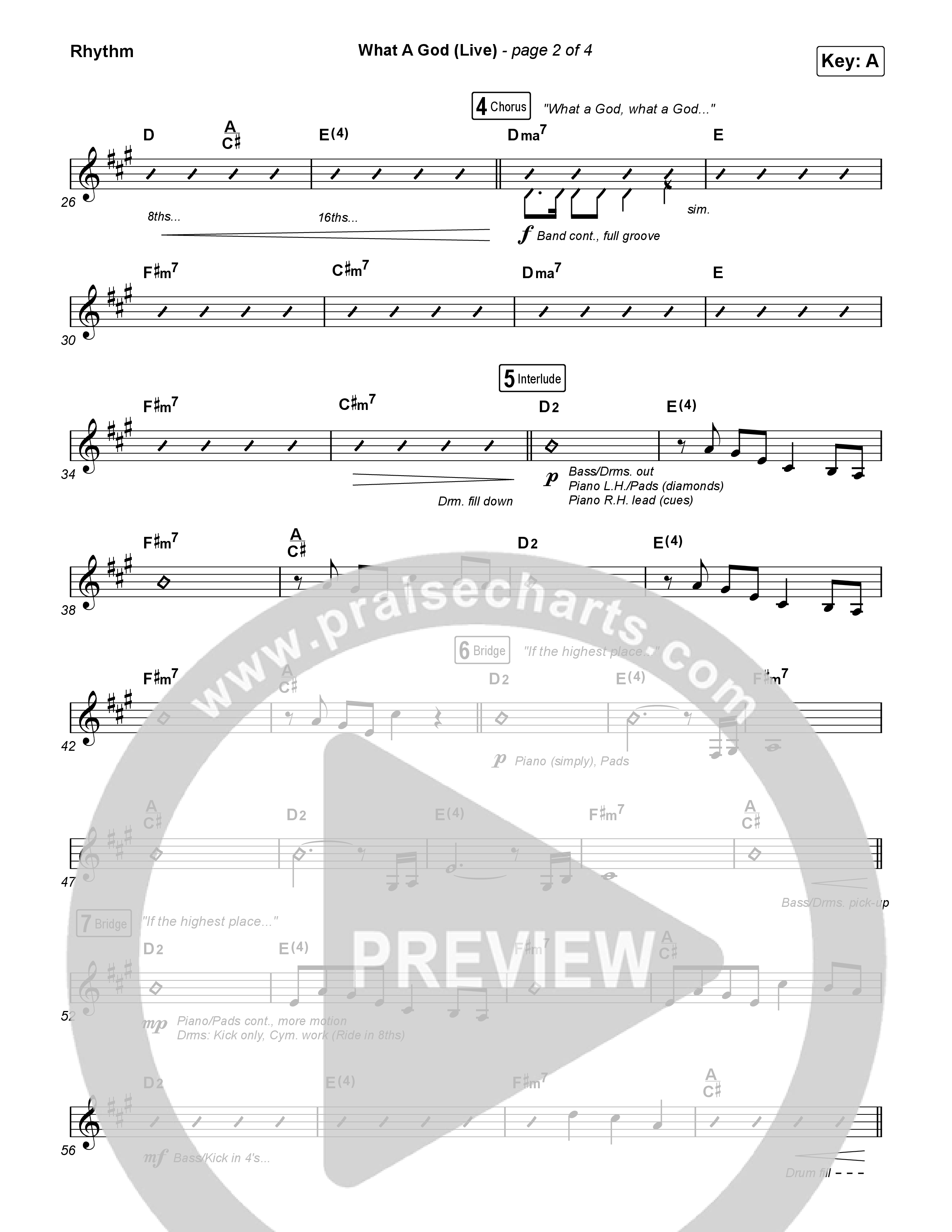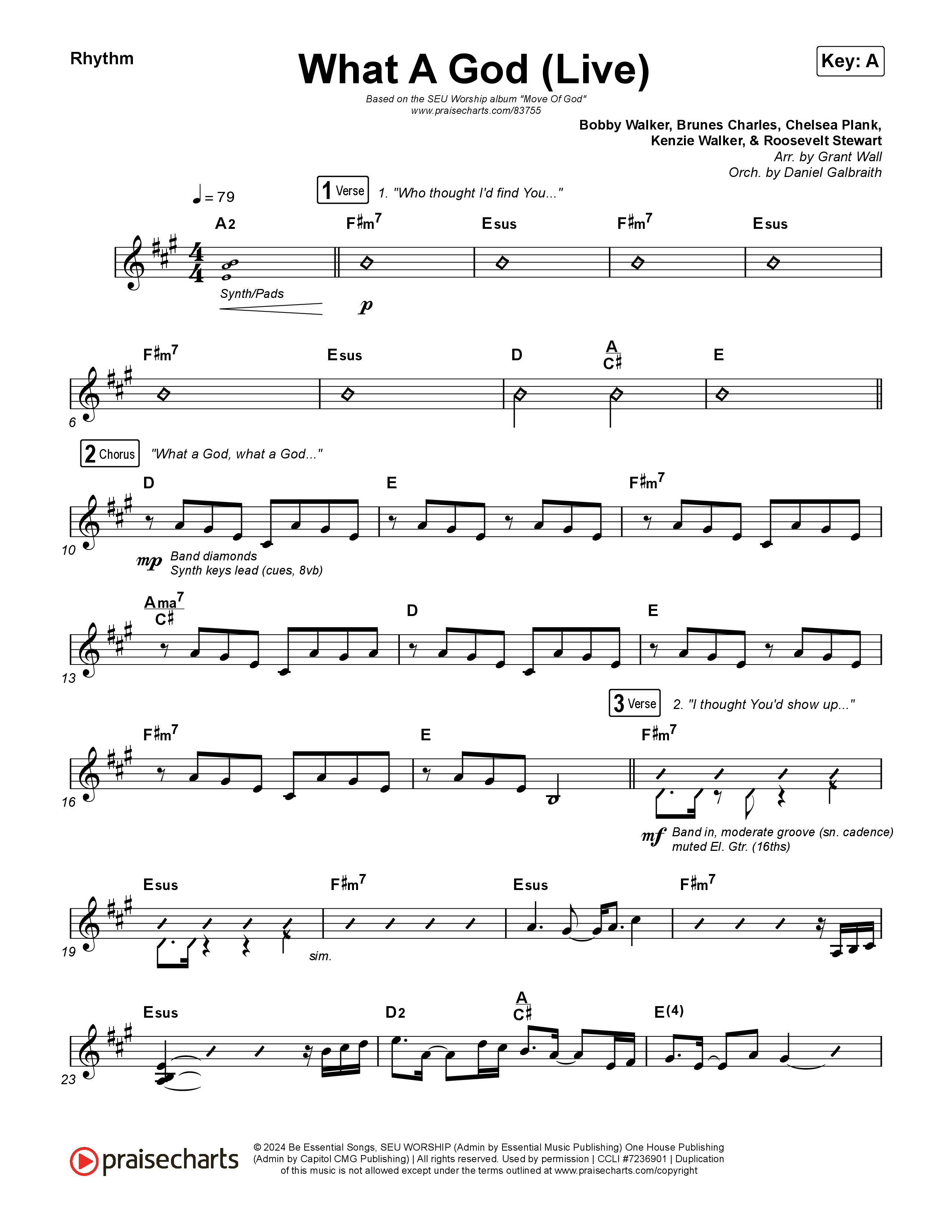 Download the Rhythm Chart for What A God (Live) by SEU Worship / One House / Chelsea Plank / Kenzie Walker / Roosevelt Stewart, from the album Move Of God. This song was arranged by Grant Wall / Daniel Galbraith in the key of A, Ab.