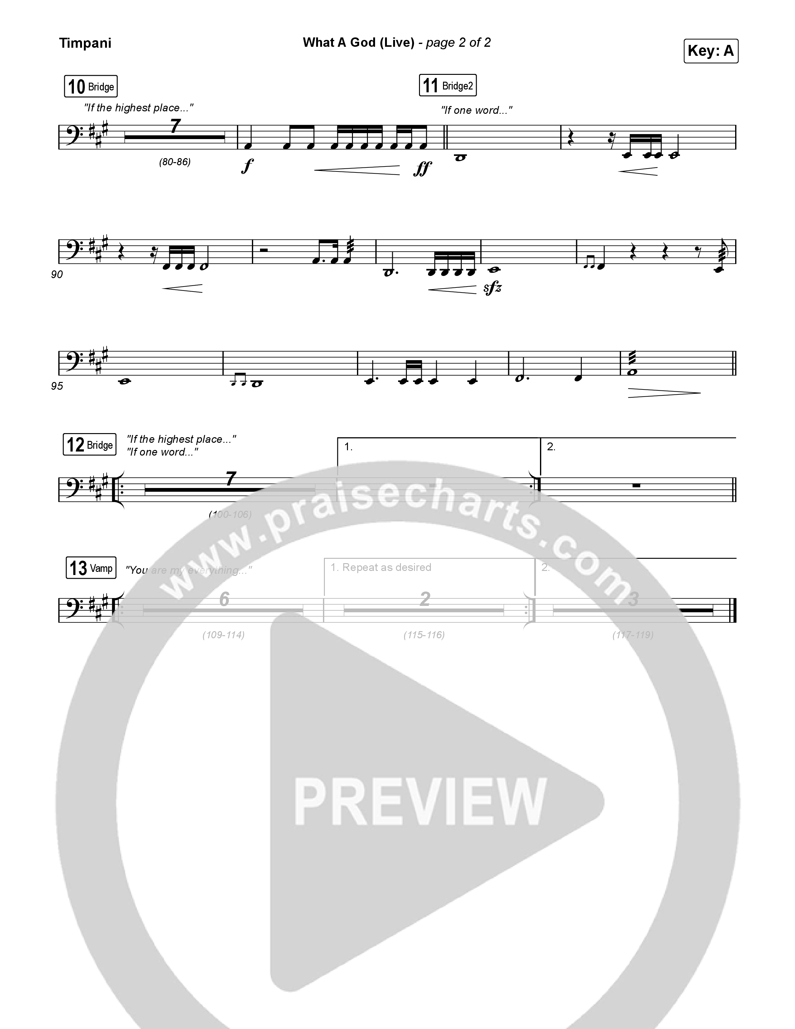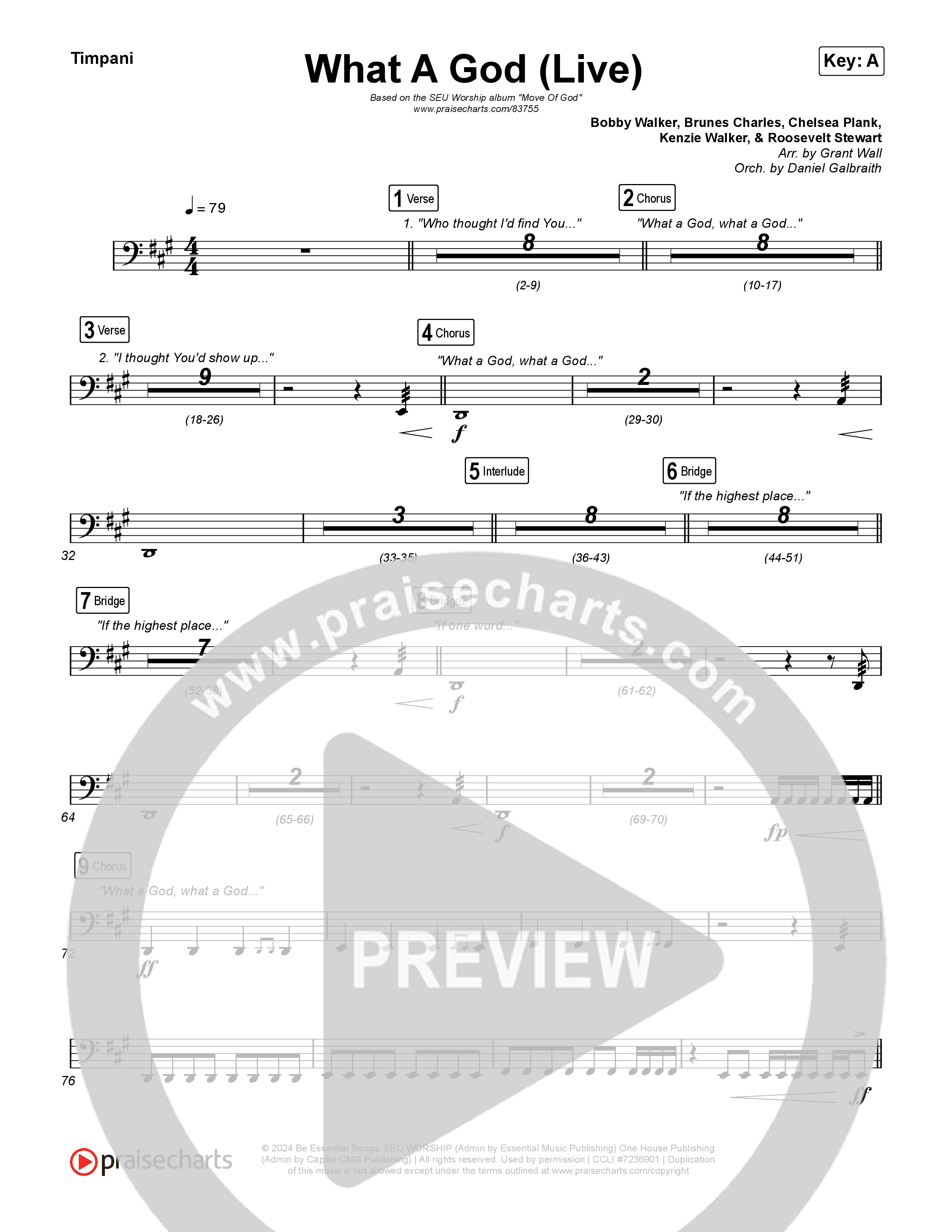 Download the Timpani sheet music for What A God (Live) by SEU Worship / One House / Chelsea Plank / Kenzie Walker / Roosevelt Stewart, from the album Move Of God. This song was arranged by Grant Wall / Daniel Galbraith in the key of A, Ab.