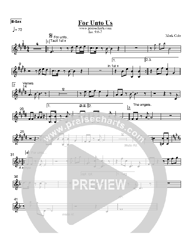 Download the Bari Sax sheet music for For Unto Us by Mark Cole, from the album Songs Of Mark Cole. This song was arranged by Mark Cole in the key of G.