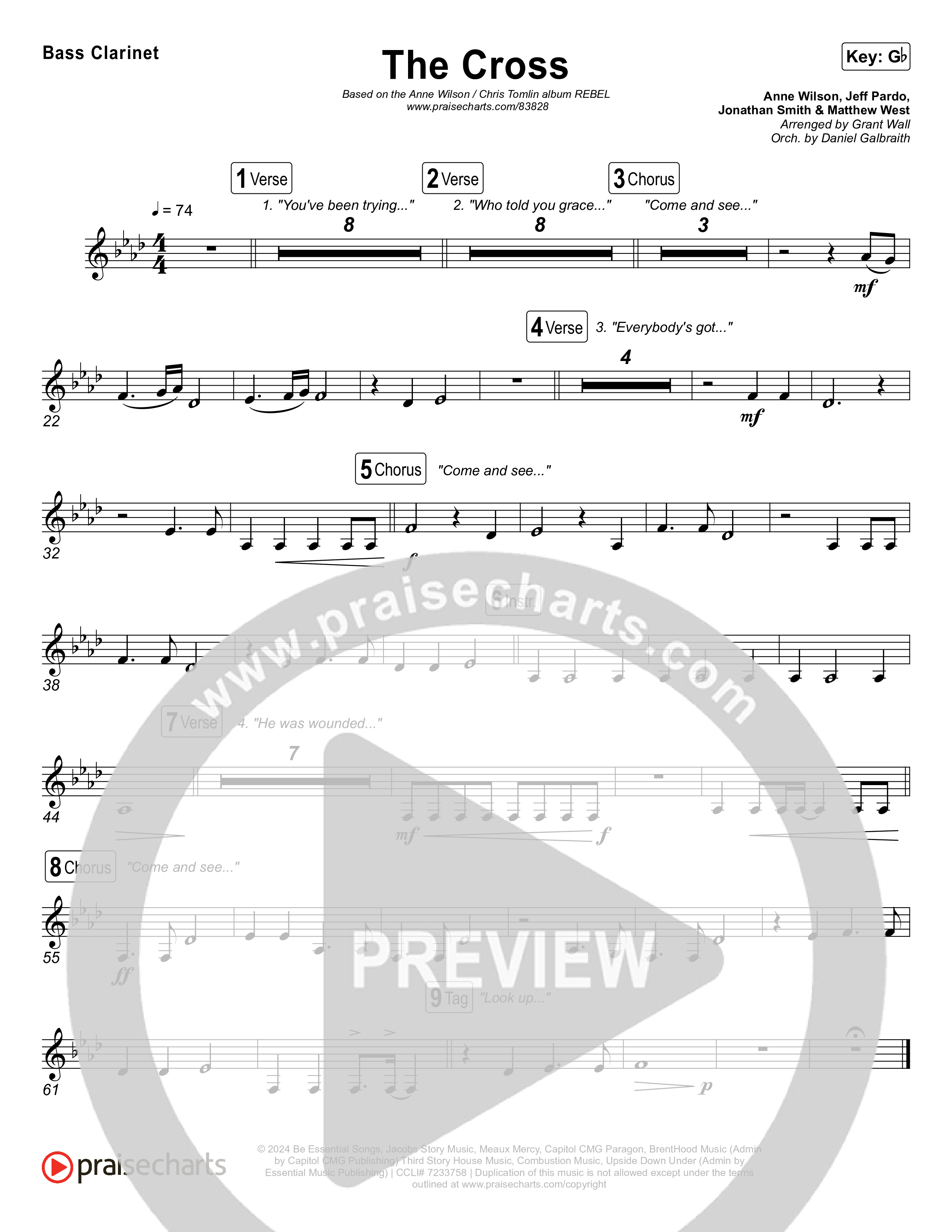 Download the Bass Clarinet sheet music for The Cross by Anne Wilson / Chris Tomlin, from the album REBEL. This song was arranged by Grant Wall / Daniel Galbraith in the key of D, G, Gb.