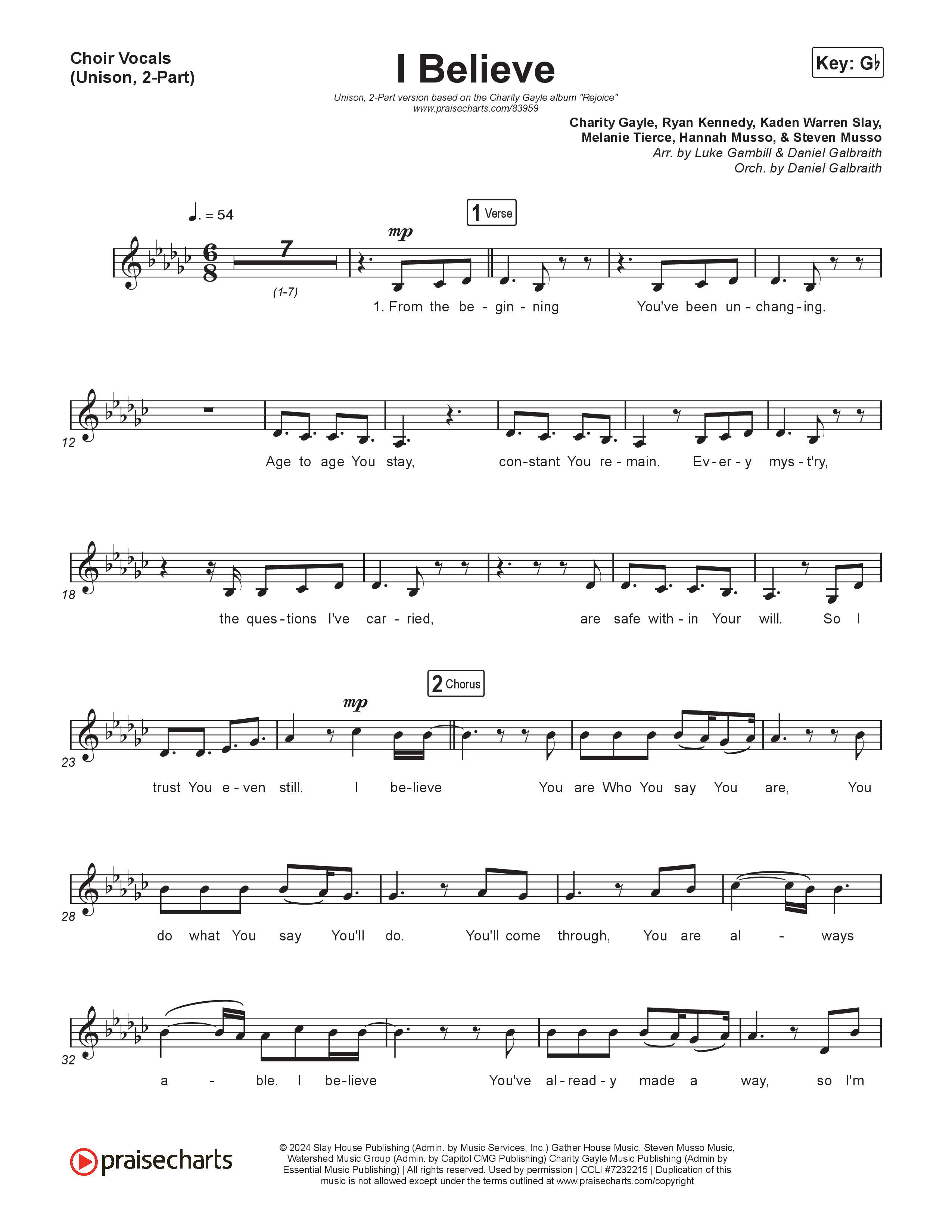 Download the PDF sheet music for I Believe (Unison/2-Part) by Charity Gayle / Arr. Luke Gambill, from the album Rejoice. This song was arranged by Daniel Galbraith / Luke Gambill in the key of Gb.