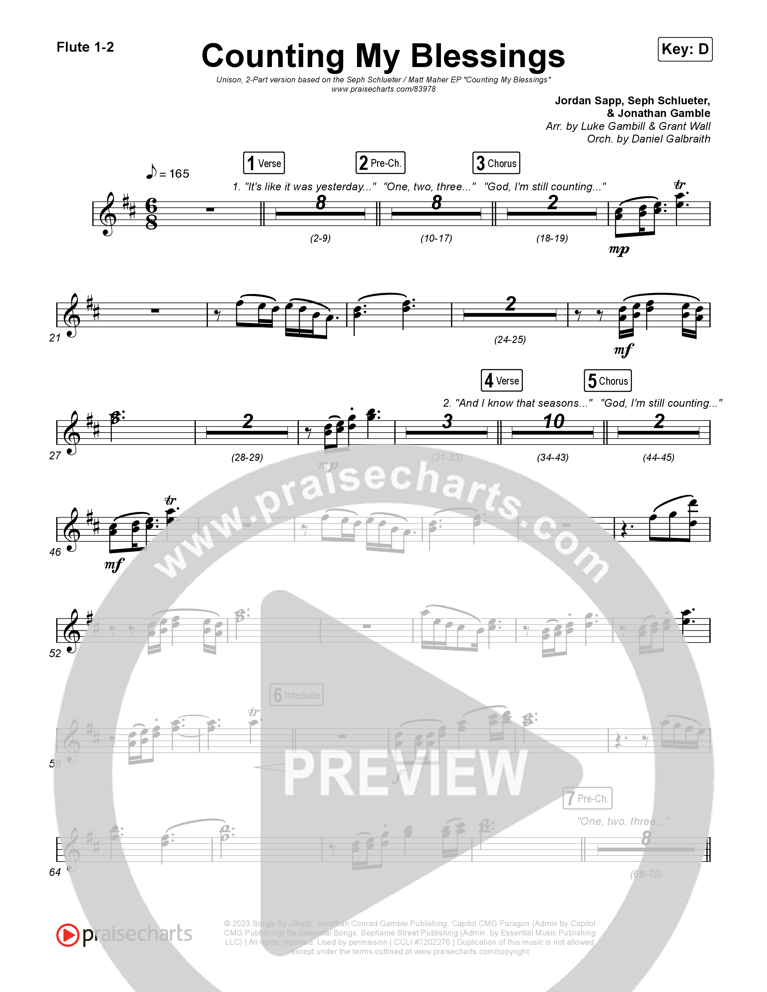 Download the Flute sheet music for Counting My Blessings (Unison/2-Part) by Seph Schlueter / Matt Maher, from the album Counting My Blessings EP. This song was arranged by Grant Wall / Daniel Galbraith in the key of D.